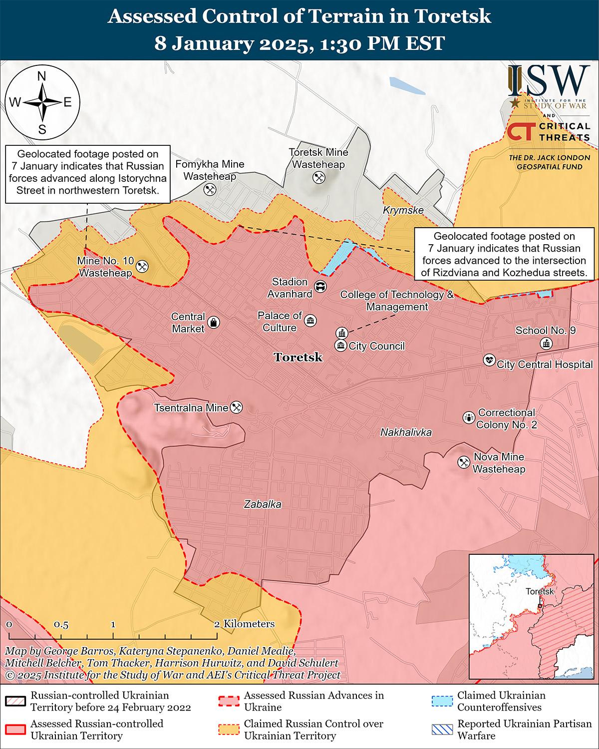 8 января российские войска продолжили наступление на севере и северо-западе Торецка на фоне продолжающихся наступательных действий в этом районе. Геолоцированные кадры, опубликованные 7 и 8 января, указывают на то, что российские войска в последнее время незначительно продвинулись на севере и северо-западе Торецка. [32] Российские военные блогеры утверждают, что российские войска продвинулись в районе Торецкого рудника на севере Торецка, вытесняют украинские войска из Дачного (к северу от Торецка) и атакуют в направлении Дилиевки (к северу от Торецка) вдоль железнодорожной линии. [33] Однако ISW не обнаружил подтверждения этих заявлений. Другой российский военный блогер отметил, что украинская группировка сил в Торецке полагалась на операции беспилотников и ограничивала мобильные штурмовые группы, чтобы не допустить российского продвижения на значительной части оспариваемой «серой зоны» в Торецке в последние месяцы, но в настоящее время российские войска продвигаются в населенном пункте более быстрыми темпами. [34] 7 и 8 января российские войска продолжили наступательные действия в самом Торецке и к северу от него в районе Дилиевки. [35] Сообщается, что в Торецке действуют подразделения российских 1-й, 9-й и 132-й мотострелковых бригад и 80-го отдельного разведывательного батальона «Спарта» (все входят в состав 51-й общевойсковой армии [ОА], ранее 1-й АК Донецкой Народной Республики [ДНР]). [36]