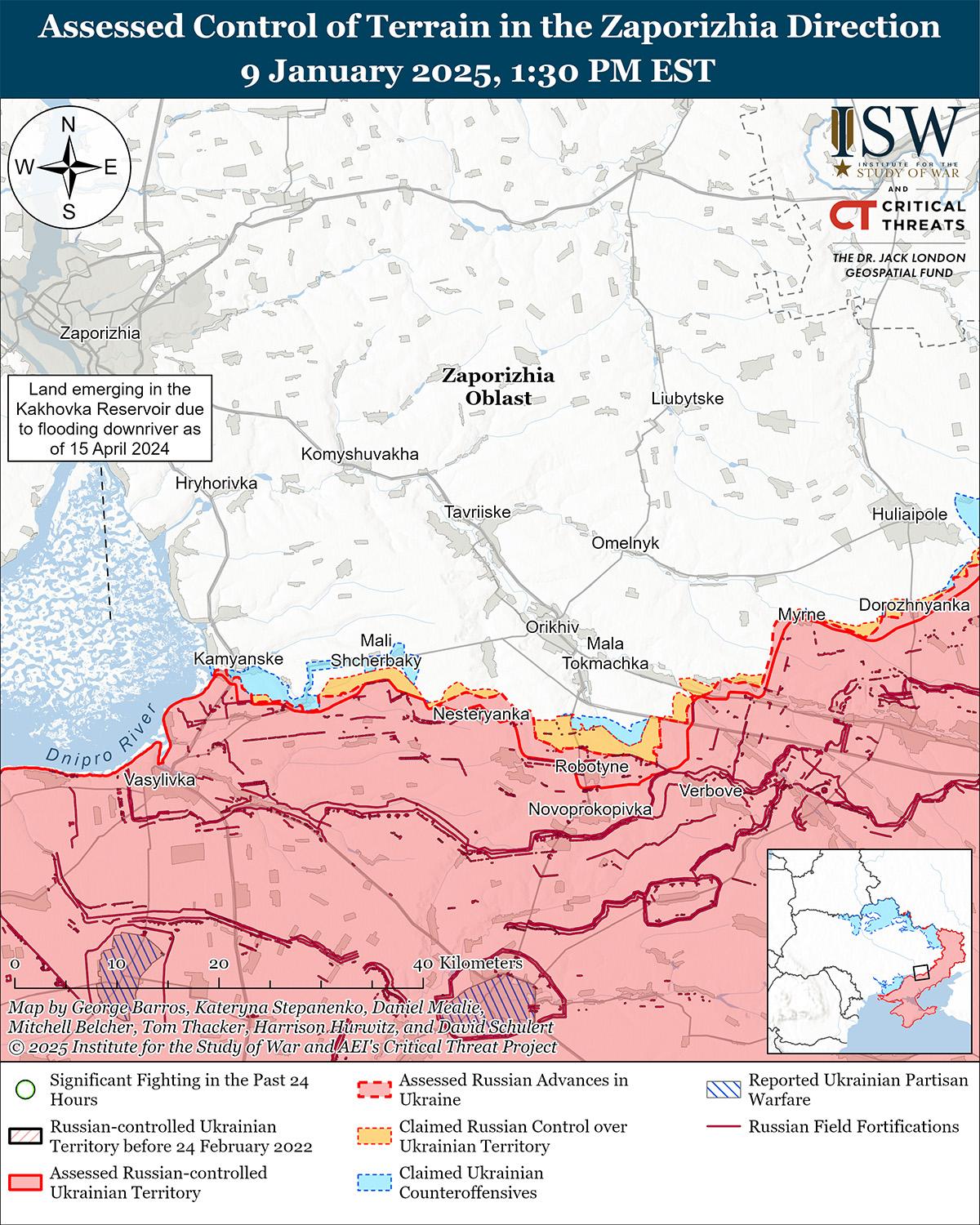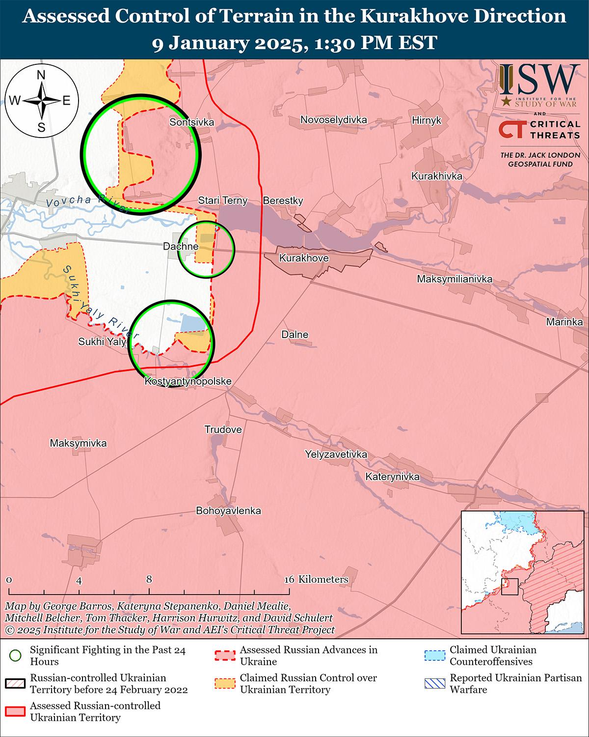 В последнее время российские войска активизировали наступательные операции, направленные на освобождение оставшейся части Курской области, и продвинулись вперед в ходе усиленного механизированного наступления численностью до батальона к северо-западу от Суджи 9 января. На геолоцированных кадрах, опубликованных украинской бригадой, действующей в Курской области 9 января, видно, что российские войска захватили Леонидово и Александрию и продвинулись к северо-западу от Никольского и к западу от Викторовки (все к северо-западу от Суджи) в ходе усиленного механизированного штурма численностью до батальона. [27] Украинская бригада, отразившая атаку, сообщила, что российские войска вели наступление в шесть волн и что в атаке было задействовано 50 танков, боевых машин пехоты (БМП), бронетранспортеров (БТР) и гражданских автомобилей. [28] В бригаде сообщили, что в ходе штурма было уничтожено неустановленное количество российской техники. Дополнительные геолоцированные кадры, опубликованные 8 и 9 января, указывают на то, что российские войска продвинулись в Погребках (к северо-востоку от Суджи в самой северной точке украинского выступа) и незначительно продвинулись в Махновке (к востоку от Суджи). [29] Российские военные блогеры утверждали, что российские войска захватили Погребки и продвинулись дальше на юг, но ISW не обнаружил подтверждения этих максималистских утверждений. [30] Российские военные блогеры утверждали, что российские войска атакуют по всему выступу, в том числе в районе самой Суджи; северо-восточнее Суджи в районе Старой Сорочины; северо-восточнее Суджи в районе Русского Поречного и Черкасского Поречного; восточнее Суджи в районе Бондаревки и Махновки; и юго-восточнее Суджи в районе Гуево и Куриловки. [31] 5 января российские войска возобновили наступление в Курской области и в течение последних четырех дней вели атаки по всему выступу, в последние месяцы в основном сосредоточившись на продвижении к востоку от Суджи. [32] Сообщается, что части российской 106-й воздушно-десантной дивизии (ВДВ) действуют в районе Свердликово (к востоку от Суджи). [33] Подразделения 30-го мотострелкового полка России (72-я мотострелковая дивизия, 44-й армейский корпус, Ленинградский военный округ) и чеченского отряда спецназа «Ахмат «Каштана» действуют в районе Бердина, а подразделения чеченского спецназа «Ахмат «Аида» действуют в районе Черкасского Поречного. [34]