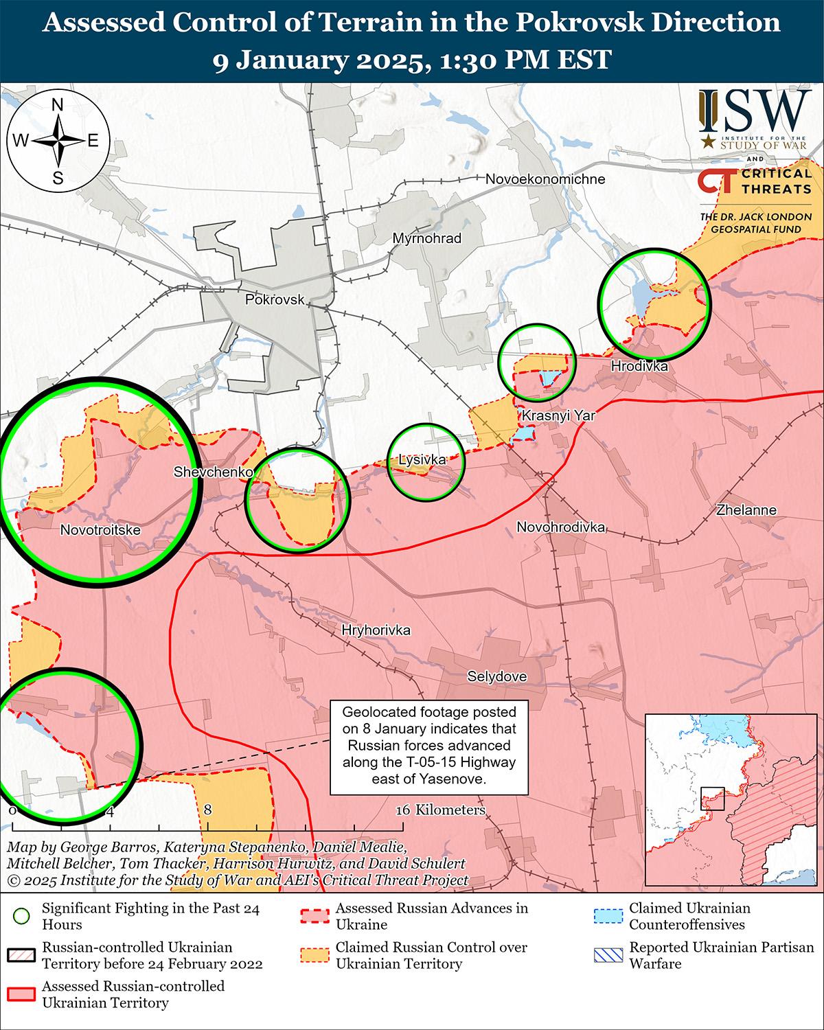 В последнее время российские войска продвинулись на Покровском направлении на фоне продолжающихся наступательных действий в этом районе 9 января. Геолоцированные кадры, опубликованные 8 января, свидетельствуют о том, что российские войска в последнее время продвинулись к востоку от Ясеново (к югу от Покровска). [58] Российские военные блогеры утверждали, что российские войска продвинулись к юго-востоку от Котлино (к западу от Покровска), к Ясеново, под Волково, на окраине Зверево (все к юго-западу от Покровска), на два километра в ширину и 500 метров в глубину к югу от Барановки, в пределах Барановки, в 700 метрах у Воздвиженки (оба к востоку от Покровска) и на 500 метров в Новоелизаветовке (к юго-западу от Покровска). [59] Однако ISW не обнаружил подтверждения этих заявлений. Российские войска вели наступательные действия в районе самого Покровска; к востоку от Покровска в районе Барановки, Миролюбовки, Елизаветовки, Водяного Второго и Проминя; юго-восточнее Покровска в районе Лысовки; южнее Покровска в районе Зеленого и Нового Труда; к юго-западу от Покровска в районах Песчаного, Зверева, Успеновки, Нововасильевки, Надеждки, Соленого и Новоелизаветовки; и западнее Покровска в районе Котлино 8 и 9 января. [60] Российские источники утверждали, что российские войска пытаются обойти центральное Песчаное с севера и что одной из главных целей российских военных на Покровском направлении является продвижение к Удачному (к юго-западу от Покровска), от которого, по словам военного блогера, российские войска находятся в 1,5 километрах. [61] ISW изучил геолокационные данные, позволяющие установить, что российские войска находятся примерно в четырех километрах от Удачного. Российский военный блогер заявил, что украинские войска сохраняют присутствие в западной части Нововасильевки. [62] Исполняющий обязанности спикера украинской бригады, действующей на Покровском направлении, заявил, что российские войска атакуют в этом районе практически круглосуточно, но не имеют достаточных сил и средств для лобового наступления на Покровск и пытаются обойти город. [63] По словам пресс-секретаря, российские войска не используют много техники в этом районе и в основном передвигаются пешком.
