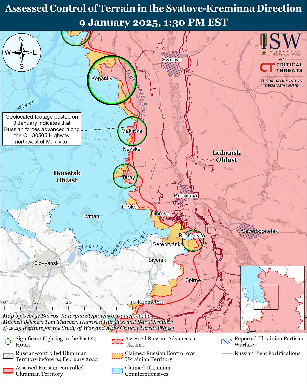 В последнее время российские войска продвинулись к юго-востоку от Боровой на фоне продолжающихся наступательных действий на Боровом направлении 9 января. Геолоцированные кадры, опубликованные 9 января, свидетельствуют о том, что российские войска продвинулись к западу и северо-западу от Макеевки (к юго-востоку от Боровой). [45] Враг продолжил атаки к северо-востоку от Боровой в районах Колизниквики, Загрызово, Зеленого Гая, Борисовки, Андреевки и Копанки; к востоку от Боровой в районе Новоегоровки и Твердохлебово; и юго-восточнее Боровой в районе Макеевки и Грековки 8 и 9 января. [46]