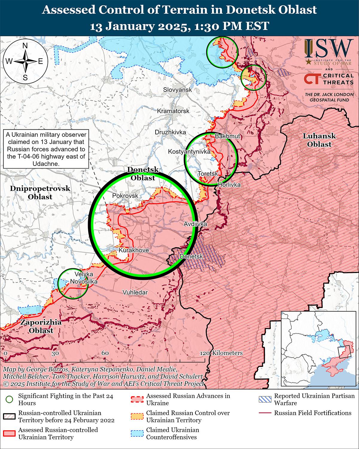 Российские войска недавно перерезали трассу Т-0504 Покровск-Константиновка к востоку от Покровска и трассу Т-0406 Покровск-Межова к юго-западу от Покровска в рамках своих усилий по окружению Покровска и Мирнограда. Геолоцированные кадры, опубликованные 12 января, свидетельствуют о том, что российские войска недавно продвинулись к востоку от Мирного (к востоку от Покровска) и захватили позиции вдоль трассы Т-0504. [1] Украинский военный обозреватель Константин Машовец заявил 13 января, что подразделения российских 55-й и 74-й мотострелковых бригад (41-я общевойсковая армия, Центральный военный округ) недавно продвинулись к трассе Т-0406 между Котлино и Удачным (оба к юго-западу от Покровска) и перерезали его, а российские военные блогеры утверждают, что российские войска захватили участок обеих трасс. [2] По оценкам ISW, российские войска, вероятно, захватили оставшуюся часть Соленого (к юго-западу от Покровска) в рамках этого наступления. Машовец заявил, что российские войска развертывают 55-ю и 74-ю мотострелковые бригады в двухэшелонном боевом порядке, и что части 74-й бригады ведут наступление в первом эшелоне, а части 55-й бригады следуют за ними, чтобы удержать позиции. Машовец заявил, что в районе Нововасильевка – Успеновка – Новоалександровка (юго-западнее Покровска) действуют подразделения российских 239-го танкового полка, 228-го мотострелкового полка и 67-го стрелкового полка (все – 90-я танковая дивизия, ЦВО). [3] Машовец признал, что российское военное командование недавно передислоцировало части российской 5-й мотострелковой бригады (51-я ОА, бывший 1-й армейский корпус Донецкой Народной Республики [АК ДНР]) с Кураховского направления для проведения наступательной операции в районе Воздвиженки (к востоку от Покровска), что еще раз подтвердило предыдущие заявления военного блогера о том, что 5-я бригада была передислоцирована в район Воздвиженки[4] Подразделения 5-й мотострелковой бригады могли участвовать в перекрытии шоссе Т-0405 около Мирного, и решение российского военного командования о передислокации 5-й мотострелковой бригады предполагает, что оно отдает приоритет усилиям по продвижению в этом районе и охвату Покровска с востока, а не дальнейшему продвижению к западу от Курахово. Ранее ISW отмечал, что российские войска также могут использовать наступление к востоку от Покровска около Воздвиженки и Мирного для ликвидации украинского выступа к юго-западу от Торецка вдоль шоссе H-20 Донецк-Константиновка.[5]