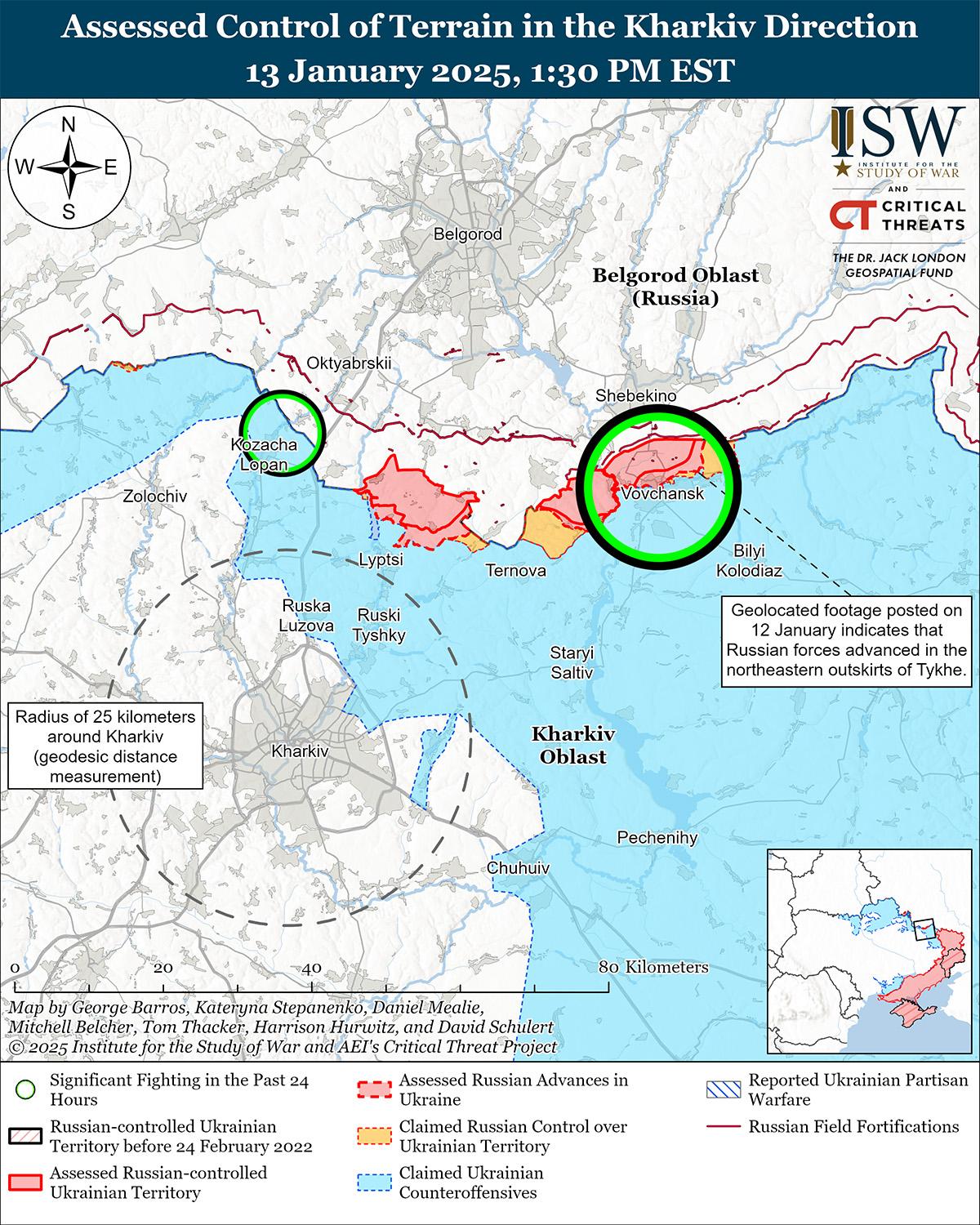 В последнее время российские войска незначительно продвинулись к северо-востоку от Харькова на фоне продолжающихся наступательных действий на севере Харьковской области 12 и 13 января. Геолоцированные кадры, опубликованные 12 января, указывают на то, что российские войска в последнее время незначительно продвинулись в лесистой местности на северо-восточной окраине Тихое (к северо-востоку от Харькова). [14] 13 января российский военный блогер заявил, что российские войска также добились неопределенного продвижения в районе Волчанска (к северо-востоку от Харькова), но ISW не обнаружил подтверждения этому заявлению. [15] 12 и 13 января российские войска вели наступательные действия вдоль международной границы к северу от Харькова в районе Казачьей Лопани и в районе Волчанска. [16] Заместитель командира украинской бригады, действующей на Харьковском направлении, сообщил 13 января, что российские войска не выделяют бронетехнику или багги для штурма из-за угрозы со стороны украинских беспилотников. [17] Командир сообщил, что российские войска проводят штурмы, отправляя на штурм украинских позиций плохо обученных, «одноразовых» солдат, за которыми следуют более подготовленные солдаты. Командующий добавил, что в последние дни российские войска примерно вдвое сократили темпы действий на Харьковском направлении.