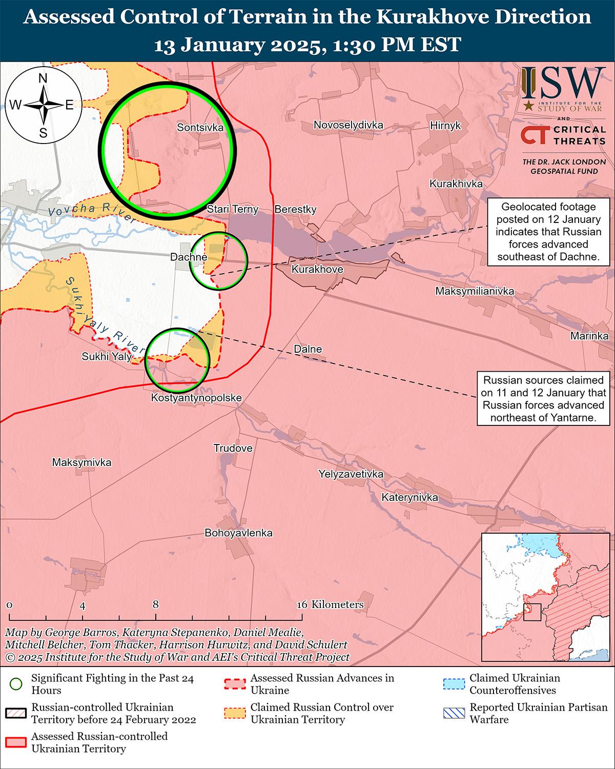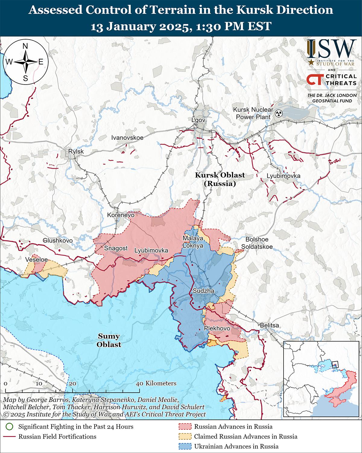 13 января российские войска продолжили наступательные действия в Курской области, но не добились подтвержденных успехов. Российские военные блогеры утверждают, что бои продолжаются к северо-западу от Суджи в районе Погребки и Кругленького; северо-восточнее Суджи в районе Русского Поречного; и юго-восточнее Суджи в районе Махновки. [11] Украинские силы специальных операций (ССО) сообщили 13 января, что недавно они отразили наступление северокорейской пехоты в Курской области, которое длилось с утра до ночи. [12]