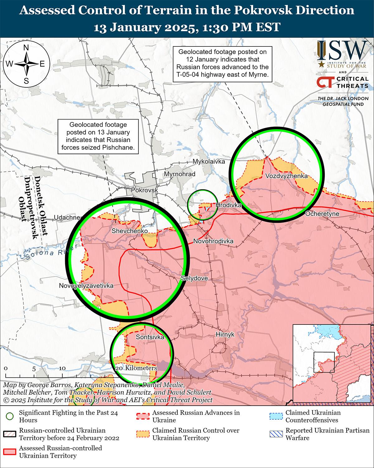 Российские войска также продвинулись в других районах к юго-западу от Покровска на фоне продолжающихся усилий по окружению города 12 января. На геолоцированных кадрах, опубликованных 13 января, указано, что российские войска захватили Песчаное (к юго-западу от Покровска), а Министерство обороны России приписало захват населенного пункта подразделениям 55-й, 35-й и 74-й мотострелковых бригад (все 41-я ОА, ЦВО). [6] Российские войска продолжали наступление в районе Покровска; к северо-востоку от Покровска в районе Барановки, Зеленого Поля, Новой Полтавки и Тарасовки; восточнее Покровска в районе Новоторецкого, Новоалександровки, Миролюбовки, Елизаветовки, Проминя и Мирнограда; юго-восточнее Покровска в районе Лысовки; южнее Покровска в районе Нового Труда, Зеленого и Шевченко; к юго-западу от Покровска в районе Удачного, Успеновки, Нововасильевки, Новоандреевки, Срибного и Ясеново; и западнее Покровска в районе Котлино 12 и 13 января. [7]