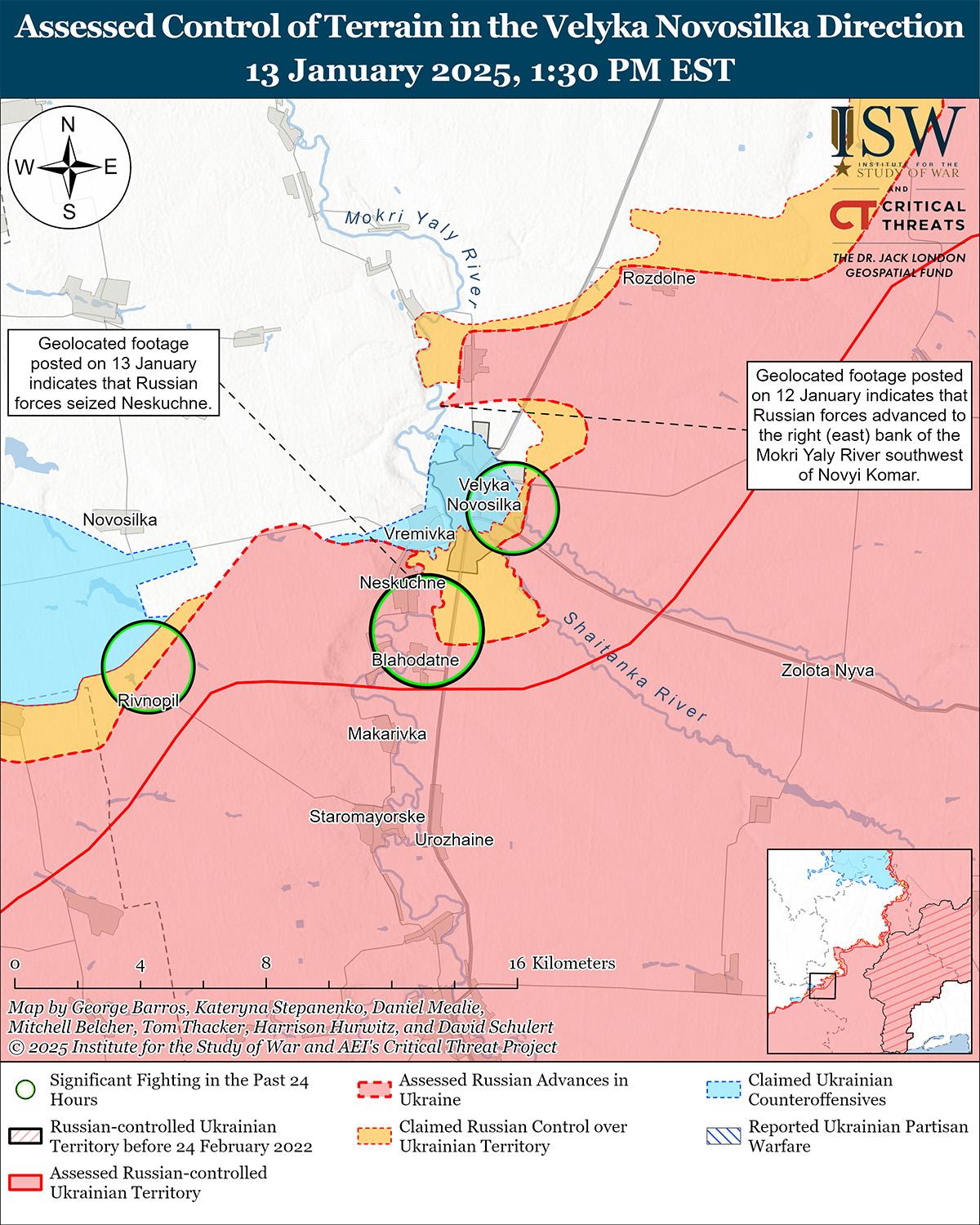 В последнее время российские войска продвинулись на Великом Новоселковском направлении на фоне продолжающихся наступательных действий в этом районе 13 января. Геолоцированные кадры, опубликованные 12 и 13 января, свидетельствуют о том, что российские войска, действующие к северу от Великой Новоселки, продвинулись на восточный (левый) берег реки Мокрые Ялы к юго-западу от Нового Комара и что российские войска, вероятно, захватили Нескучное (к юго-западу от Великой Новоселки). [51] 12 и 13 января некоторые российские источники утверждали, что российские войска еще не захватили Нескучное и что украинские войска сохраняют позиции в северном Нескучном. [52] Российский военный блогер заявил 12 января, что российские войска находятся в километре от конечных украинских логистических линий в районе Великой Новоселки. [53] 13 января Машовец заявил, что российские войска почти завершили окружение Времовки и Великой Новоселки с севера, юга и юго-востока, и прогнозирует, что в ближайшие дни российские войска могут провести «решающую» операцию по захвату населенных пунктов. [54] 12 и 13 января российские войска продолжили атаки к западу от Великой Новоселки в районе Времовки и к юго-западу от Великой Новоселки в районе Ровнополя и Нескучного. [55] Машовец сообщал, что части российской 127-й мотострелковой дивизии (5-я ОА, Восточный военный округ) продолжают бои за дорогу Великая Новоселка – Успеновка между Новоселкой (западнее Великой Новоселки) и Времовкой, а также что подразделения российской 37-й мотострелковой бригады (36-я ОА, ВВО) при поддержке подразделений 336-й бригады морской пехоты (Балтийский флот, ЛВО) ведут бои под Новым Комаром. [56]