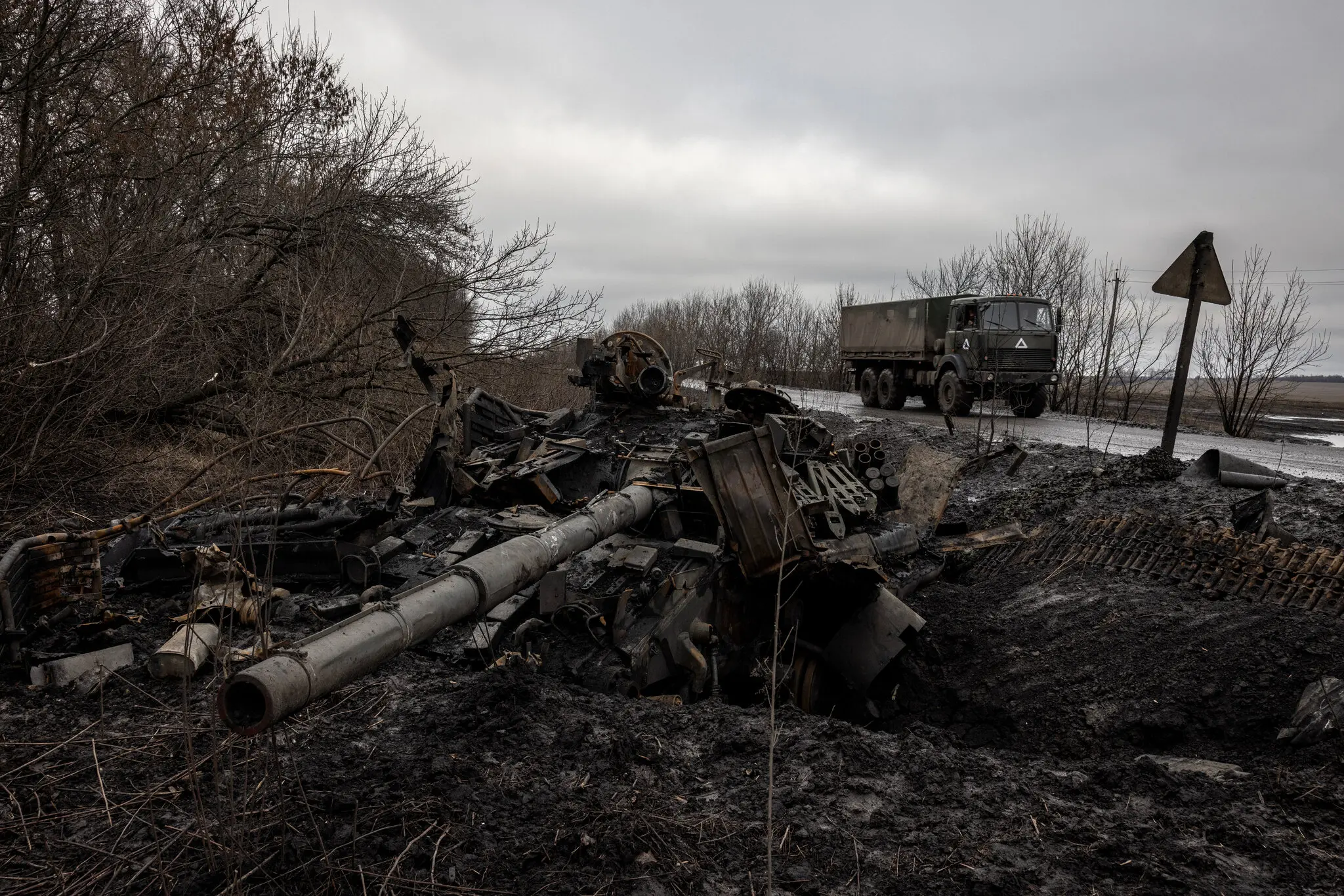 Уничтоженный украинский танк в четверг в нескольких милях от границы с Курской областью России. Фото…