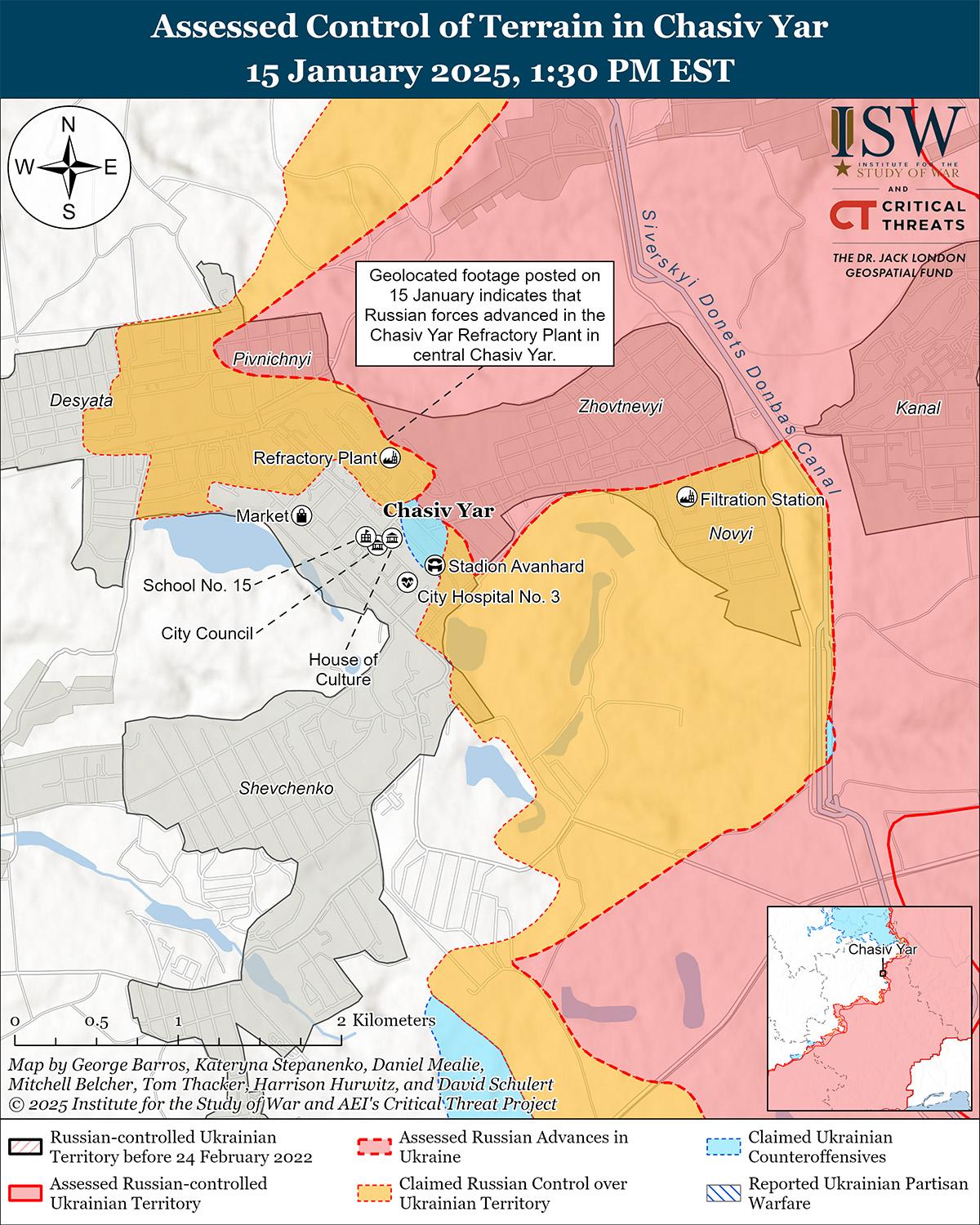 В последнее время враг продвинулся в направлении Часова Яра на фоне продолжающихся наступательных действий на этом направлении 15 января. Геолоцированные кадры, опубликованные 15 января, указывают на то, что российские войска недавно продвинулись в районе огнеупорного завода в центре Часова Яра. [34] 14 и 15 января российские войска продолжали наступление в районе Часова Яра и к югу от него в районах населенных пунктов Предтечино, Ступочки и Александро-Шультино. [35] Сообщается, что операторы беспилотников 200-й отдельной гвардейской мотострелковой бригады (14-й армейский корпус Ленинградского военного округа) действуют в районе Часова Яра. [36]