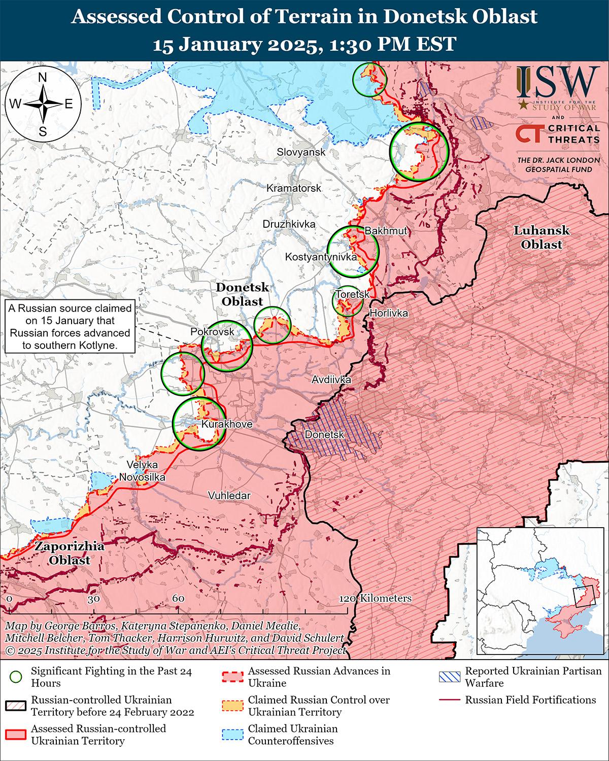 15 января враг продолжил наступательные действия на Покровском направлении, но подтвержденных успехов не достиг. Российские военные блогеры утверждали, что российские войска продвинулись к востоку от Удачного, к северо-западу от Ясеново, к западу от Новоелизаветовки, до восточной части Новосергиевки и Успеновки, а также к югу от Зверево и Котлино (все к юго-западу от Покровска). [41] Однако ISW не обнаружил подтверждения этих заявлений. 15 января Министерство обороны России заявило, что подразделения 80-го танкового полка РФ (90-я танковая дивизия, 41-я ОА, Центральный военный округ) захватили Украинку, хотя, по оценкам ISW, российские войска захватили населенный пункт по состоянию на 27 декабря. [42] Российские войска продолжали наступательные действия под Покровском; северо-восточнее Покровска в районе Новой Полтавки и Тарасовки; к востоку от Покровска в районе Барановки, Новоторецкого, Елизаветовки и Проминя; юго-восточнее Покровска в районе Лысовки; южнее Покровска в районе Нового Труда, Шевченко, Чунышино и Зеленого; к юго-западу от Покровска в районе Зверево, Успеновки, Новоандреевки, Ясеново и Надеждки 14 и 15 января. [43] Заместитель командира украинского батальона, действующего на Покровском направлении, заявил, что российские войска не развертывают оптоволоконные беспилотники в этом районе, потому что у них нет опытных пилотов дронов для управления ими. [44] Украинские военные заявили, что российские войска усиливают удары управляемыми планирующими бомбами и беспилотниками на Покровском направлении из-за благоприятных погодных условий. [45] Украинский военный обозреватель Константин Машовец заявил, что в районе Котлино действуют подразделения российского 433-го мотострелкового полка (27-я мотострелковая дивизия, 2-я ОА, ЦВО) и 55-й и 74-й мотострелковых бригад (41-я ОА); подразделения 35-й мотострелковой бригады (41-я ОА) действуют в районе населенных пунктов Зеленое – Чунышино – Даченское (южнее Покровска); подразделения 589-го и 506-го мсп (27-я мотострелковая дивизия) и 137-й мотострелковой бригады (41-я ОА) действуют в районе Николаевки-Мирнограда (юго-восточнее и восточнее Покровска); подразделения 239-го танкового полка, 428-го стрелкового полка и 87-го стрелкового полка (все 90-я танковая дивизия) действуют в районе Успеновки; части 6-го и 90-го танковых полков, 228-го мотострелкового полка и 67-го стрелкового полка (все 90-я танковая дивизия) действуют в районе Ясеново – Словянка – Петропавловка (юго-восточнее Покровска). [46]