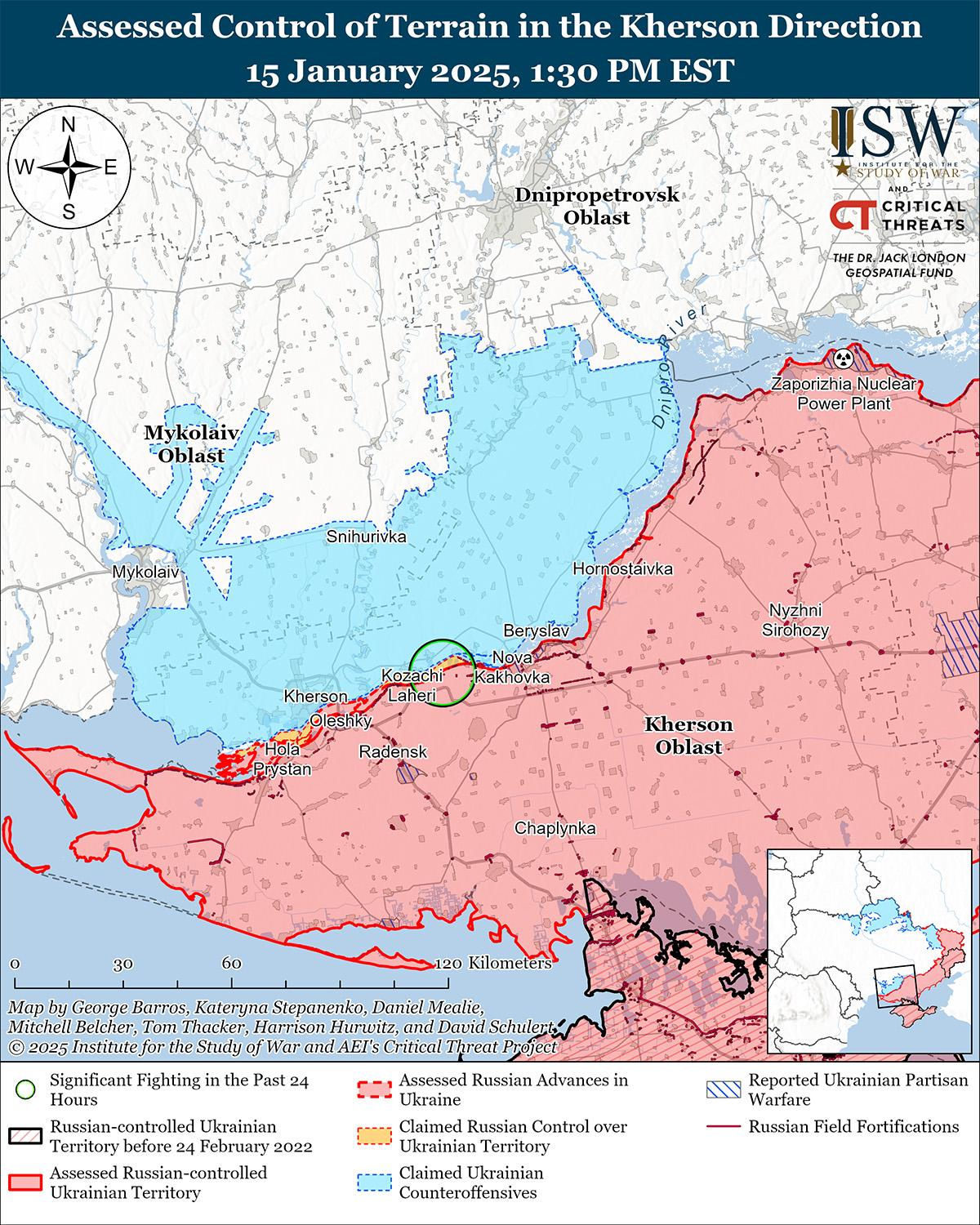 15 января враг продолжил наступательные действия на Украинском выступе в Курской области, но не продвинулся вперед. Российский военный блогер опроверг утверждения о том, что российские войска захватили Махновку (к югу от Суджи), в то время как другой военный блогер заявил, что российские войска скоро захватят населенный пункт. [19] Другой военный блогер повторил утверждения о том, что российские войска захватили Черкасское Поречное, но ISW не обнаружил подтверждения этому заявлению. [20] Бои продолжались к северо-западу от Суджи в районе Кругленького, Николаевки и Николаево-Дарьино; к северу от Суджи в районе Черкасского Поречного, Погребки, Старая Сорочина и Новая Сорочина; и южнее Суджи в районе Махновки 14 и 15 января. [21] Сообщается, что части российской 106-й воздушно-десантной дивизии (ВДВ) и 83-й бригады ВДВ действуют в районе южного Николаево-Дарьино (к северо-западу от Суджи); по сообщениям, подразделения российской 155-й бригады морской пехоты (Тихоокеанский флот, Восточный военный округ [ВВО]) действуют в Малой Локне (к северу от Суджи); а также подразделения российского 104-го полка ВДВ (76-я дивизия ВДВ), как сообщается, продолжают действовать в Курской области. [22]
