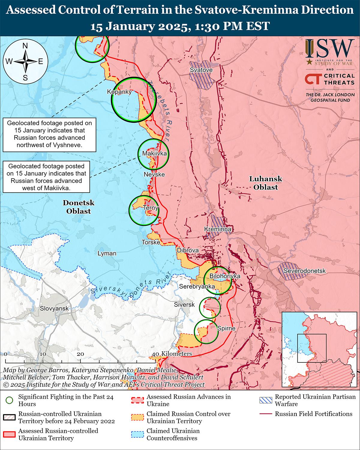 В последнее время российские войска продвинулись к северо-востоку и юго-востоку от Боровой на фоне продолжающейся наступательной операции на этом направлении 15 января. Геолоцированные кадры, опубликованные 4, 14 и 15 января, свидетельствуют о том, что в последнее время российские войска продвинулись к северу и северо-западу от Вишневого (к северо-востоку от Боровой) и к западу от Макеевки (к юго-востоку от Боровой). [26] Российские войска атаковали северо-восточнее Боровой в районе Новой Крутяновки и Богуславки; к востоку от Боровой в районе Копанки; и юго-восточнее Боровой в районе Макеевки, Грековки, Новосергиевки и Твердохлебово 14 и 15 января. [27] Сообщается, что подразделения российской 27-й мотострелковой бригады (1-я гвардейская танковая армия, Московский военный округ) действуют в районе Зеленого Гая (к северо-востоку от Боровой). [28]