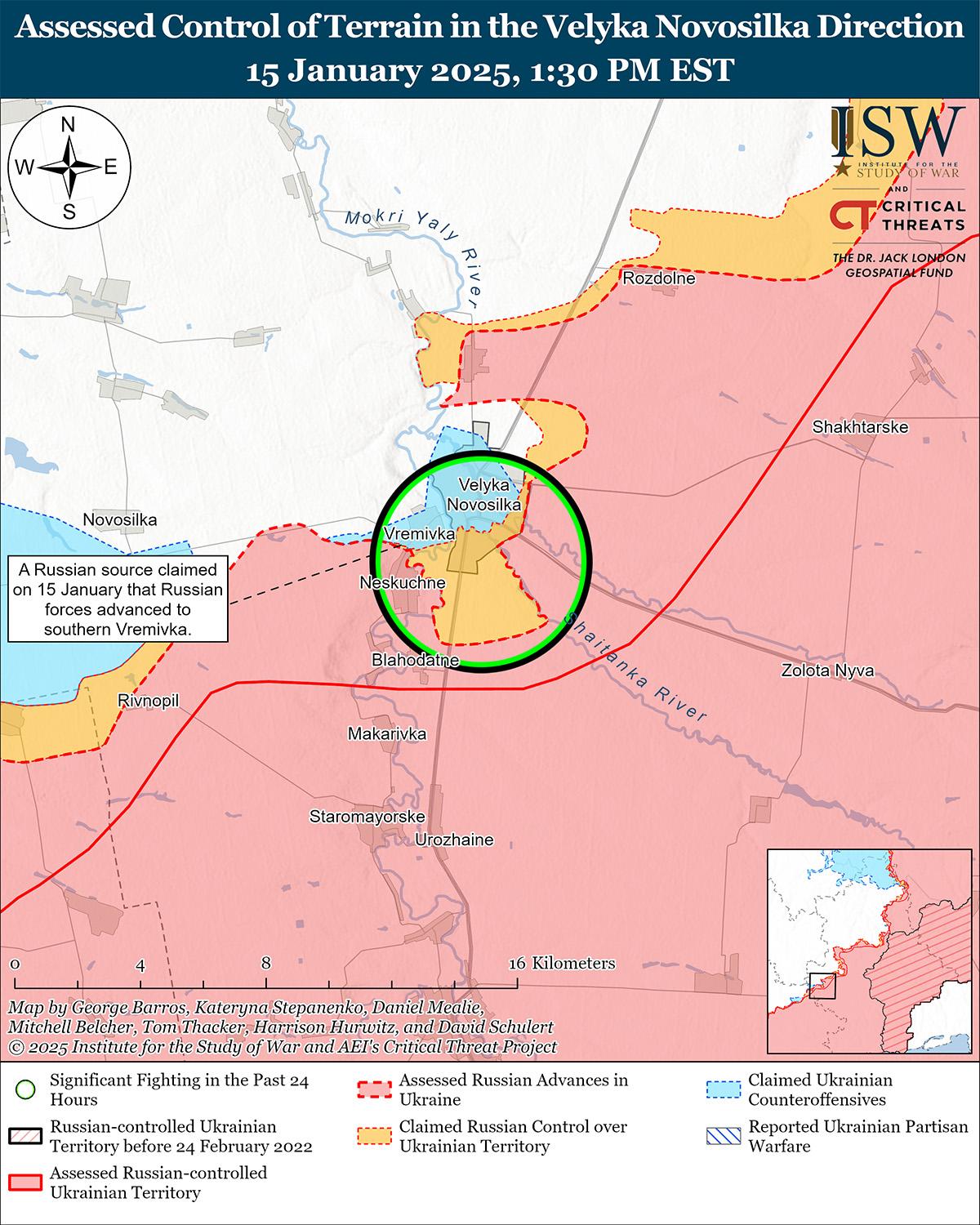 15 января враг продолжил наступательные действия на Великоновоселковом направлении, но подтвержденных успехов не достиг. Российский военный блогер заявил, что российские войска продвинулись к Времовке (непосредственно к западу от Великой Новоселки). [51] 14 и 15 января российские войска продолжали атаки в районах Великой Новоселки, Времовки и Нескучного (к юго-западу от Великой Новоселки). [52]