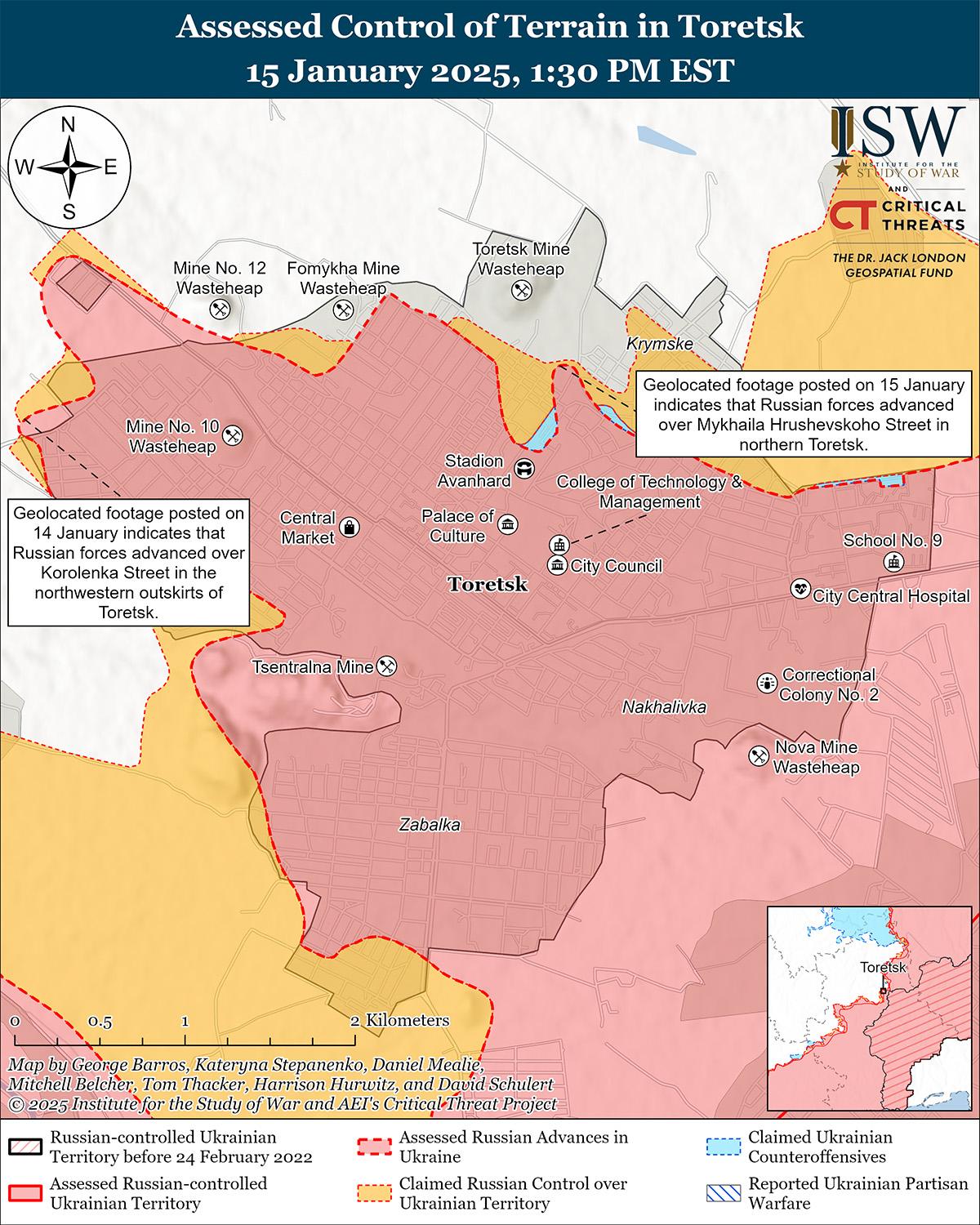 В последнее время российские войска продвинулись в Торецке на фоне продолжающихся наступательных действий в этом районе 15 января. Геолоцированные кадры, опубликованные 14 января, указывают на то, что российские войска в последнее время продвинулись на северо-западе и севере Торецка. [37] Российские военные блогеры утверждали, что российские войска продвигаются в районе Щербиновки (к западу от Торецка), но ISW не зафиксировал подтверждения этому заявлению. [38] 14 и 15 января российские войска продолжали атаки в районе Торецка и к западу от него в районе Щербиновки. [39] Сообщается, что подразделения российской 132-й мотострелковой бригады (51-я общевойсковая армия, бывший 1-й АК Донецкой Народной Республики [ДНР]) действуют вблизи Торецка. [40]