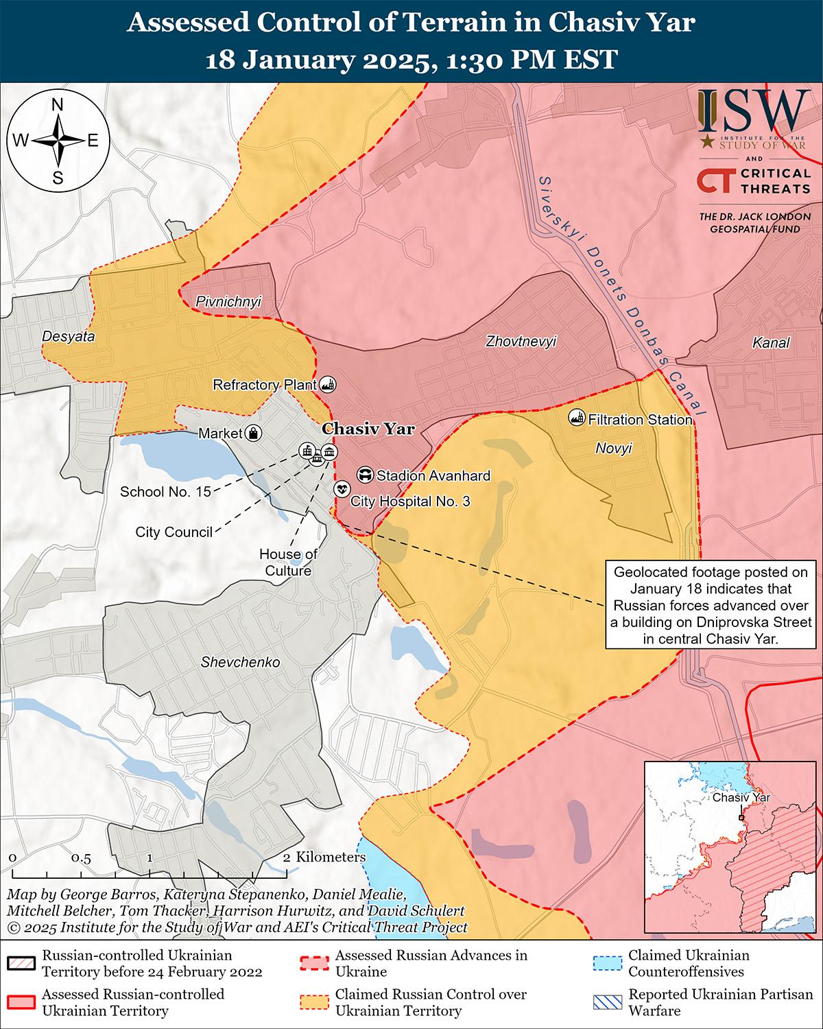 В последнее время российские войска продвинулись в Часовом Яру на фоне продолжающихся наступательных действий на Часово Ярском направлении 18 января. На геолоцированных кадрах, опубликованных 18 января, видно, как украинские войска наносят удары по двум российским бронемашинам, вероятно, 98-й воздушно-десантной дивизии (ВДВ) РФ, в районе улицы Днепровской в центре Часова Яра, что указывает на то, что российские войска недавно продвинулись в населенном пункте. [41] Российские источники утверждали, что российские войска захватили огнеупорный завод в Часовом Яру. [42] Однако ISW не обнаружил визуальных доказательств этого утверждения. Украинский военный обозреватель Константин Машовец заявил, что части российской 4-й мотострелковой бригады (3-я общевойсковая армия, бывший 2-й армейский корпус Луганской Народной Республики) при поддержке 299-го и 331-го полков ВДВ (оба входят в состав 98-й дивизии ВДВ) и 200-й мотострелковой бригады (14-й АК Ленинградского военного округа) пытаются захватить север Часова Яра и что российские войска захватили плацдарм в Северном микрорайоне (север Часова Яра). [43] 17 и 18 января российские войска продолжали наземные атаки в районе Часова Яра и к югу от Часова Яра в районе Ступочки и Белой Горы. [44] Сообщается, что операторы беспилотников российской бригады «Север-В» (Добровольческий корпус РФ) действуют в районе Часова Яра. [45] Сообщается, что танкисты российской добровольческой разведывательно-штурмовой бригады «Невский» (Добровольческий корпус РФ) действуют вблизи Соледара (к северо-востоку от Часова Яра). [46]