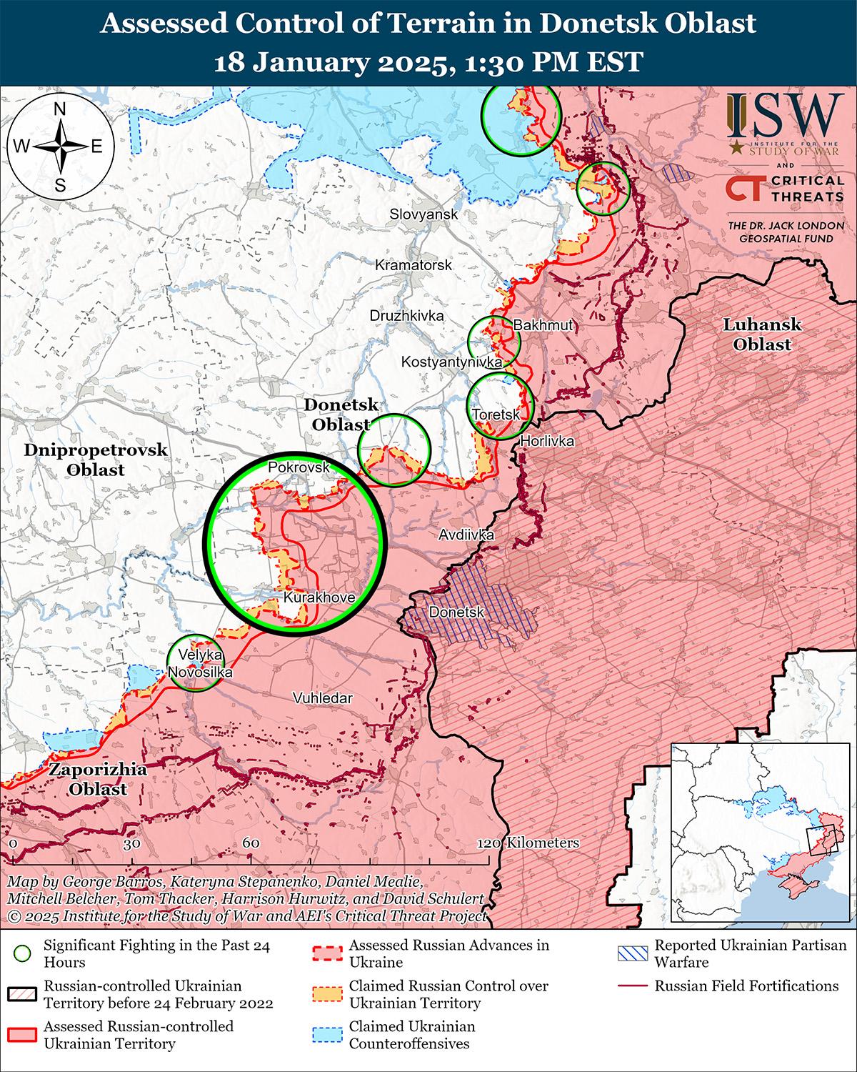 Сообщается также, что российское военное командование передислоцировало подразделения второго соединения 51-й ОА с Кураховского направления для наступательных действий к востоку от Покровска на фоне продолжающихся усилий по активизации деятельности в этом районе. 17 и 18 января несколько российских военных блогеров заявили, что подразделения 110-й мотострелковой бригады (51-я ОА, бывший 1-й армейский корпус Донецкой Народной Республики [АК ДНР]) недавно продвинулись к югу от Зеленого Поля (к северо-востоку от Покровска). [14] По наблюдениям ISW от 18 января поступили сообщения о том, что на Кураховском направлении действуют подразделения 110-й мотострелковой бригады, что указывает на то, что российское военное командование, возможно, недавно передислоцировало отдельные подразделения 110-й мотострелковой бригады на Покровское направление, если утверждения военных блогеров верны. [15] Ранее в ISW поступали сообщения о том, что российское военное командование передислоцировало подразделения 5-й мотострелковой бригады (51-я ОА) в район Воздвиженки (к востоку от Покровска) из Курахово. [16] 18 января Машовец сообщил, что подразделения 5-й мотострелковой бригады и 1195-го и 1438-го мотострелковых полков (41-я ОА) атакуют к востоку от Покровска от Воздвиженки и Новоторецкое-Тимофеевки (юго-западнее Воздвиженки) в направлении Елизаветовки (западнее Воздвиженки). [17] Машовец также сообщил, что подразделения российских 506-го и 589-го мотострелковых полков (оба входят в состав 27-й мотострелковой дивизии, 2-й ОА) при поддержке подразделений 137-й мотострелковой бригады (41-й ОА) безуспешно атакуют в направлении Николаевка-Мирноград и Николаевка-Промин (все к востоку от Покровска). Российские военные блогеры утверждают, что российские войска сосредотачивают свои атаки к востоку от Покровска вокруг Водяного Второго (к северо-востоку от Воздвиженки), Зеленого Поля и Тарасовки (оба к северу от Воздвиженки), вероятно, в рамках продолжающихся усилий России по формированию широкого выступа, который российские войска могут использовать для окружения Покровска с северо-востока в будущем. [18] Российское военное командование, возможно, снижает приоритетность наступательных операций на Кураховском направлении и перебрасывает силы из Курахово для усиления Покровского направления теперь, когда российские войска выполнили свою задачу по захвату Курахово, поскольку, как сообщается, подразделения 5-й и 110-й бригад участвовали в захвате Курахово в конце декабря 2024 года. [19] Неясно, усилило ли российское командование или в достаточной степени восстановило деградировавшие российские части, которые недавно участвовали в боях за захват Курахово и его окрестностей до такой степени, чтобы они могли эффективно действовать на нынешней линии фронта в Покровске.
