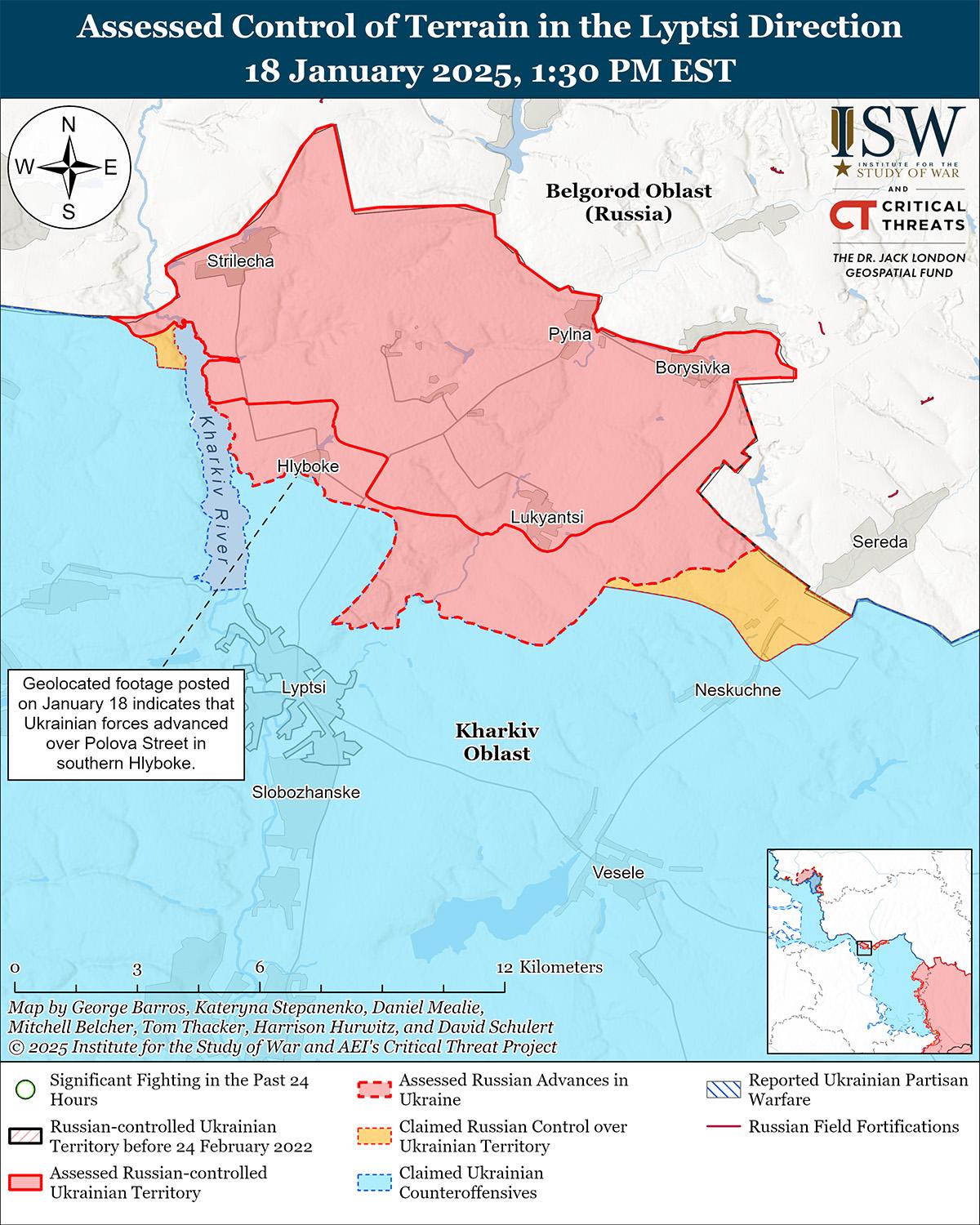 Украинские войска недавно отбили утраченные позиции к северу от Харькова на фоне продолжающихся российских наступательных действий в этом районе 18 января. На геолоцированных кадрах, опубликованных 18 января, видно, что украинские войска недавно вернули утраченные позиции в южном Глубоком (к северу от Харькова). [29] 17 и 18 января российские войска продолжили наступательные действия к северо-востоку от Харькова в районе Волчанска. [30] Сообщается, что подразделения российского 11-го армейского корпуса (АК) (Ленинградский военный округ [ЛВО]) действуют в районе Глубокого. [31]