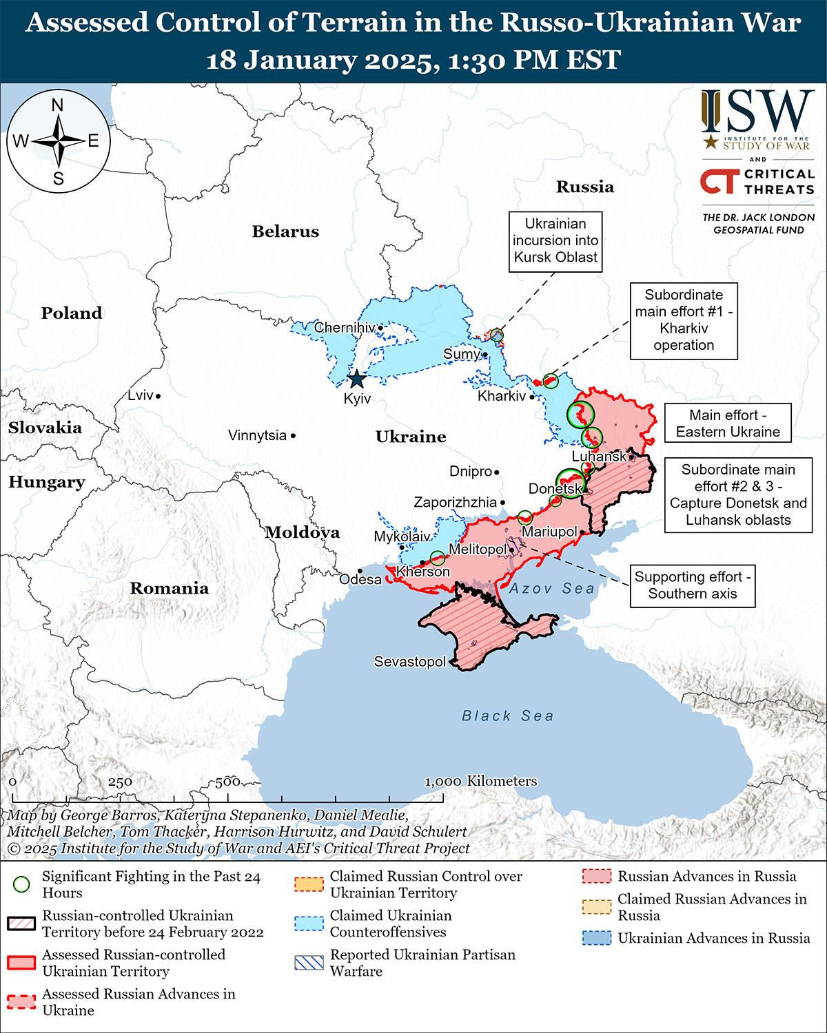 Российские войска недавно продвинулись в Курской области на фоне продолжающихся боев 18 января. Геолоцированные кадры, опубликованные 18 января, указывают на то, что российские войска недавно продвинулись к западу от Малой Локни (к северо-западу от Суджи). [24] 18 января российский военный блогер заявил, что частые туманные погодные условия в Курской области ограничивают возможности российских и украинских сил вести воздушную разведку и наносить удары беспилотниками в Курской области. [25] Сообщается, что операторы беспилотников российской 34-й отдельной мотострелковой бригады (49-я общевойсковая армия, Южный военный округ) действуют в районе Погребки (к северу от Суджи); сообщается, что операторы дронов 56-го воздушно-десантного полка (7-й дивизии ВДВ) управляют оптоволоконными дронами «Князь Вандал Новгородский» с видом от первого лица (FPV) вблизи Новоивановки, Леонидово и Александрии (все к северо-западу от Суджи); по сообщениям, подразделения 106-й дивизии ВДВ действуют в районе Николаево-Дарьино (северо-западнее Суджи); по сообщениям, в Курской области действуют подразделения 83-й бригады ВДВ и 98-й дивизии ВДВ. [26]