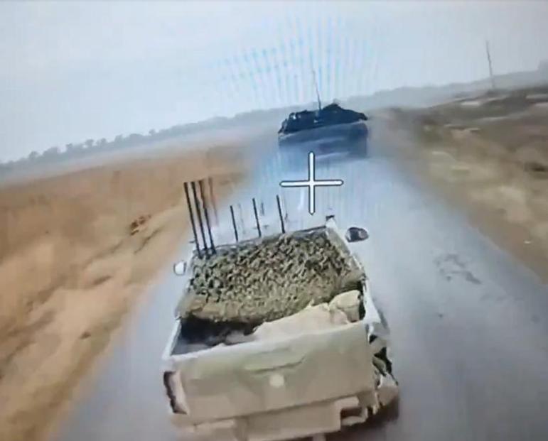 Снимок в социальных сетях российского FPV-беспилотника, управляемого оптоволоконным кабелем, пролетающего мимо украинского пикапа с оборудованием для глушения. Дрон продолжает наносить удары по бронетехнике перед пикапом. Через социальные сети.