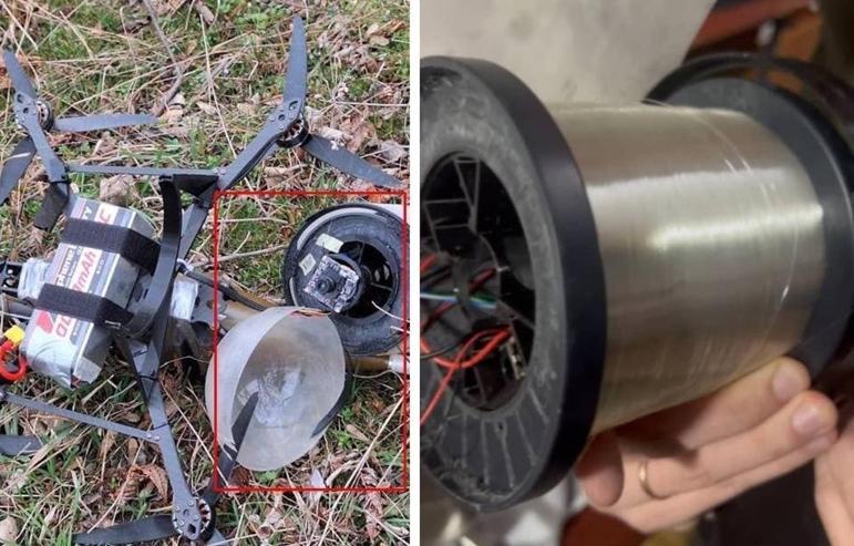 Изображения в социальных сетях захваченного российского беспилотника, управляемого оптоволоконным кабелем, который разматывается по мере того, как дрон летит. В катушке было почти 10 км оптоволоконного кабеля