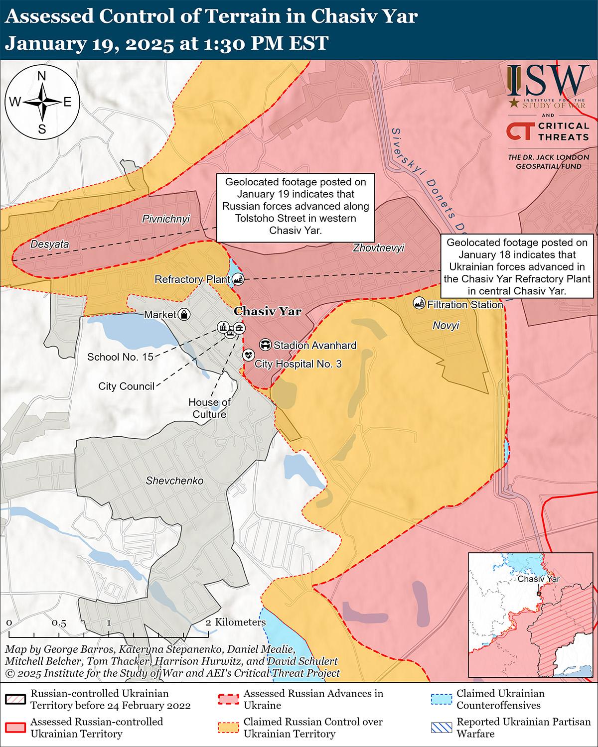 Как российские, так и украинские войска недавно продвинулись в Часовом Яру на фоне продолжающихся наступательных действий в этом районе 19 января. Геолоцированные кадры, опубликованные 18 января, свидетельствуют о том, что украинские военные недавно вернули утраченные позиции на Огнеупорном заводе в центре Часова Яра. [21] На геолоцированных кадрах, опубликованных 19 января, видно, что в последнее время российские войска продвинулись вдоль улицы Толстого в западной части Часова Яра. [22] Российские военные блогеры заявили 19 января, что российские войска захватили микрорайоны «Новосеверный» и «Десятый» в Часовом Яру, продвинулись в цеховой зоне Огнеупорного завода и на севере Часова Яра. [23] Однако ISW не обнаружил подтверждения этих заявлений. 18 и 19 января российские войска продолжили наземные атаки в самом Часовом Яру и к югу от Часова Яра в районах населенных пунктов Предтечино, Ступочки и Белой Горы. [24] Пресс-секретарь Луганской группировки войск подполковник Дмитрий Запорожец сообщил 18 января, что украинские войска отразили российские атаки малого и среднего масштаба на территории огнеупорного завода в центре Часова Яра. [25] Сообщается, что на направлении Часова Яра действуют подразделения российского 215-го разведывательного батальона (98-я дивизия ВДВ), операторы беспилотников российской казачьей разведывательной бригады «Терек» (по сообщениям, добровольческого Казачьего десантного корпуса) и операторы беспилотников российской бригады «Север-В» (Российский добровольческий корпус); Сообщается, что в самом Часовом Яру действуют дополнительные подразделения российской 98-й дивизии ВДВ и подразделения 200-й мотострелковой бригады (14-й армейский корпус, Ленинградский военный округ). [26]