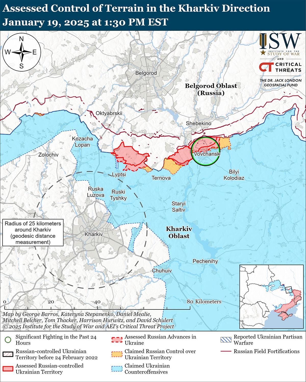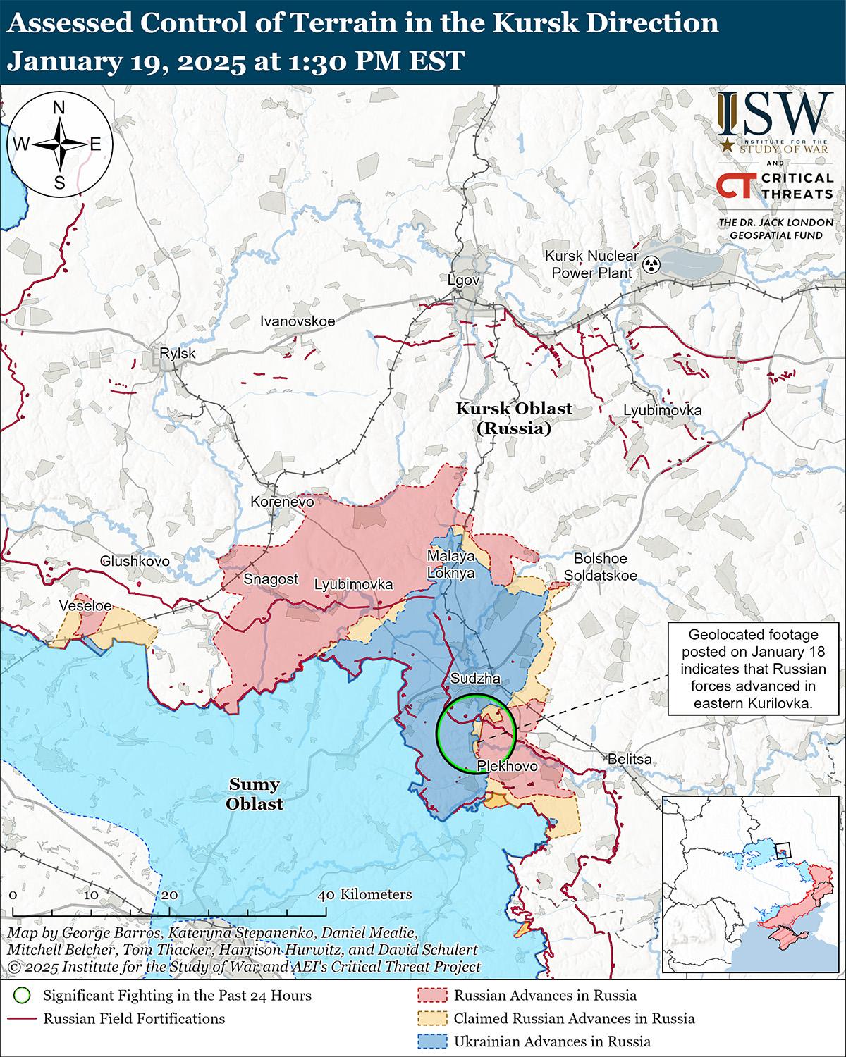 19 января российские войска продвинулись к югу от Суджи на фоне продолжающейся активности в северо-западной части Украинского выступа в Курской области. Геолоцированные кадры, опубликованные 18 января, указывают на то, что российские войска недавно продвинулись в восточной части Куриловки (к югу от Суджи). [3] Российский военный блогер заявил, что российские войска продвинулись в районе Викторовки (к северо-западу от Суджи). [4] Другой российский военный блогер заявил, что российские войска, действующие к северо-западу от Суджи, перегруппировываются в районе Старой и Новой Сорочины и атакуют в районе Николаева и Викторовки. [5] Российские военные блогеры утверждали, что украинские войска проводили разведку боем в районе населенных пунктов Малая Локня и Викторовка (оба к северо-западу от Суджи). [6] Сообщается, что подразделения российского 56-го воздушно-десантного полка (7-я дивизия ВДВ) действуют в районе Новоивановки (к северо-западу от Суджи); по сообщениям, элементы чеченского отряда спецназа «Каштан» действуют в Бердине (к северо-востоку от Суджи); Сообщается, что подразделения 83-й и 11-й бригад ВДВ и 40-й бригады морской пехоты (Тихоокеанский флот, Восточный военный округ [ВВО]) действуют в других неуказанных районах Курской области. [7]