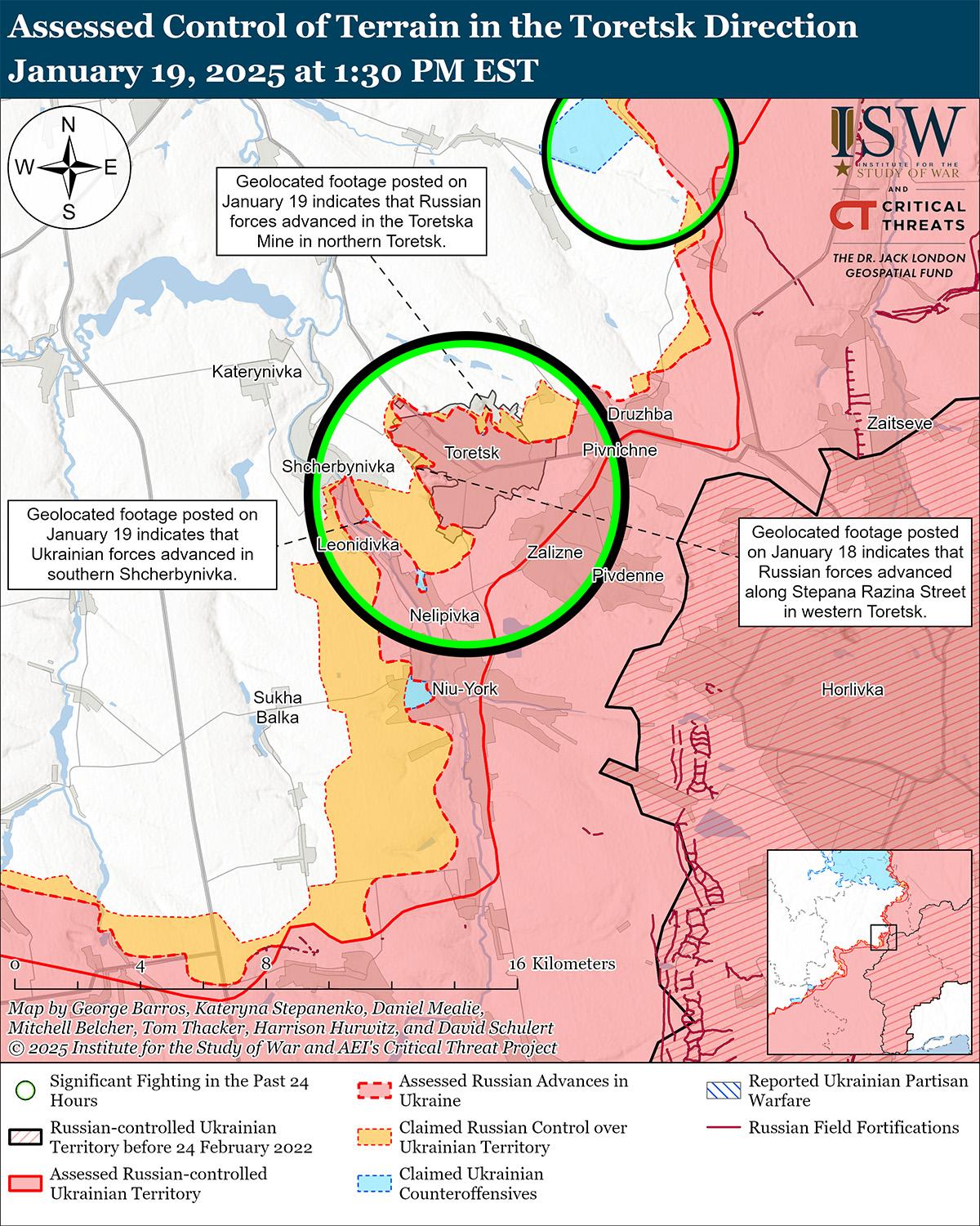 Как украинские, так и российские войска в последнее время продвинулись на Торецком направлении на фоне продолжающихся российских наступательных действий в этом районе 19 января. Геолоцированные кадры, опубликованные 19 января, свидетельствуют о том, что украинские войска недавно отбили утраченные позиции на юге Щербиновки (к юго-западу от Торецка). [27] На геолоцированных кадрах, опубликованных 19 января, видно, что в последнее время российские войска продвинулись на север по территории Торецкого рудника на севере Торецка и на северо-запад вдоль улицы Степана Разина на западе Торецка. [28] Российские военблогеры заявили 19 января, что российские войска захватили половину шахты «Торецкая» на севере Торецка, продвинулись в районе шахты «Центральная» в центре Торецка, а также продвинулись и зачищают украинские войска в Крымском (к северу от Торецка).[29] Однако ISW не обнаружил подтверждения этим заявлениям. Российские войска продолжали атаковать в Торецке, к северу от Торецка в районе Дилиевки и к юго-западу от Торецка в районе Щербиновки.[30]