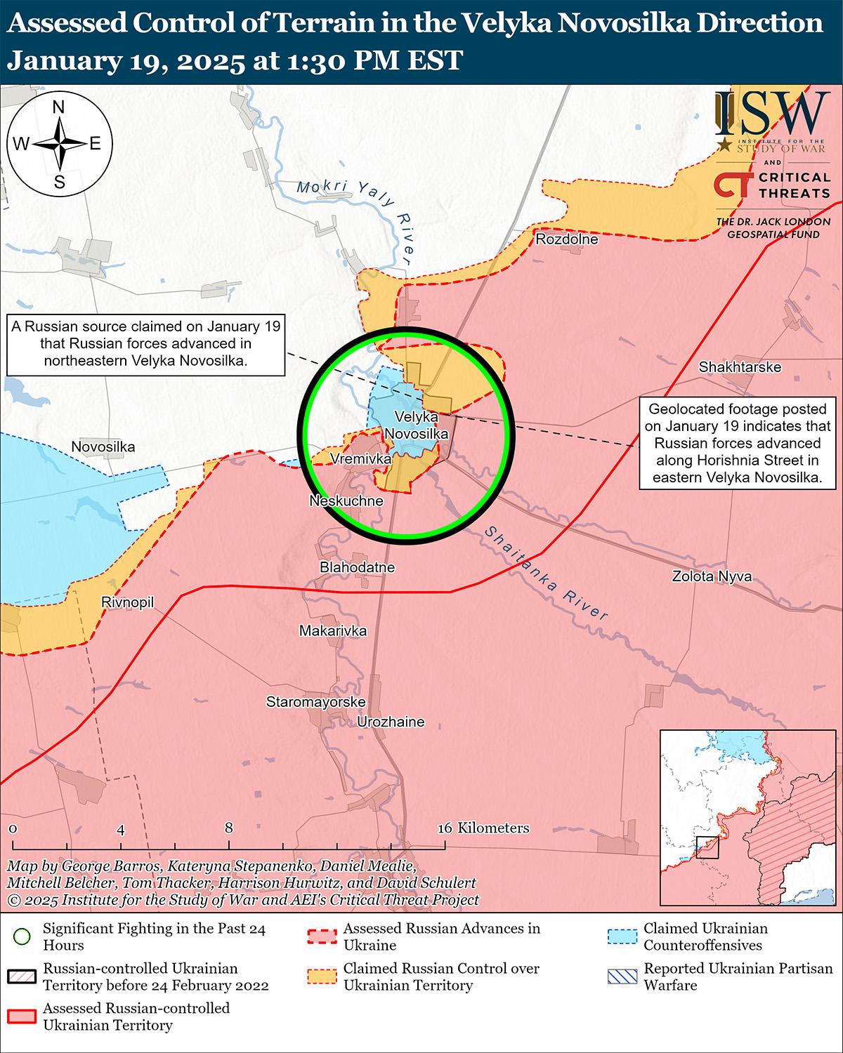 В последнее время российские войска продвинулись дальше в восточной части Великой Новоселки на фоне продолжающихся наступательных действий в этом районе 19 января. Геолоцированные кадры, опубликованные 19 января, указывают на то, что российские войска в последнее время незначительно продвинулись в восточной части Великой Новоселки. [46] 18 января российский военный блогер заявил, что российские войска продвинулись к северо-востоку от Великой Новоселки. [47] Однако ISW не обнаружил подтверждения этого заявления. Украинский источник сообщил 18 января, что российские войска недавно провели усиленную механизированную атаку численностью до роты из 13 единиц техники из Шахтерского (к северо-востоку от Великой Новоселки) в направлении Великой Новоселки, и недавние российские успехи в восточной части Великой Новоселки могут быть результатом этого механизированного штурма. [48] 18 и 19 января российские войска продолжили наступательные действия в Великой Новоселке. [49] Российские источники заявили 19 января, что российские войска атакуют и медленно продвигаются в южной, восточной и западной части Великой Новоселки. [50] Группировка войск «Хортица» заявила 19 января, что российские войска используют неблагоприятные погодные условия на Новоповском направлении (к северу от Великой Новоселки) для ведения наступательных действий и давления на украинские войска в Великой Новоселке с севера. [51]