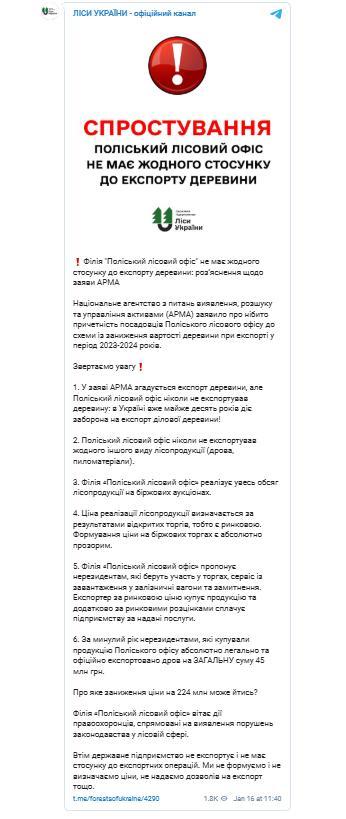 Ключові цифри за матеріалами розслідування АРМА оприлюднило своєму сайті. ДП “Ліси України” у той же день опублікувало відповідь в офіційному Telegram-каналі.