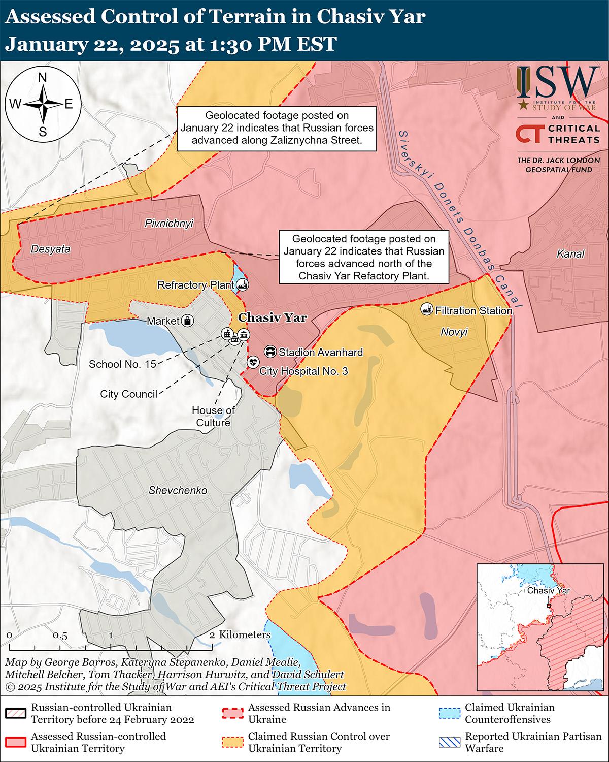 В последнее время российские войска продвинулись на направлении Часов Яр на фоне продолжающихся наступательных действий в этом районе 22 января. Геолоцированные кадры, опубликованные 22 января, указывают на то, что российские войска недавно продвинулись вдоль улицы Железной на северо-западе Часова Яра и в последнее время незначительно продвинулись к северу и северо-западу от огнеупорного завода «Часов Яр» в центре Часова Яра. [45] Российский военный блогер утверждал, что российские войска продвинулись дальше вдоль улицы Центральной в центре Часова Яра, но ISW не обнаружил подтверждения этому заявлению. [46] 21 и 22 января враг продолжал наземные обстрелы в районе Часова Яра и к северу от Часова Яра в направлении Федоровки. [47] Сообщается, что снайперы российского 299-го воздушно-десантного полка (98-я дивизия ВДВ) действуют в самом Часовом Яру, а подразделения российского 215-го разведывательного батальона (98-я дивизия ВДВ) наносят удары по украинским позициям в самом Часовом Яру. [48]