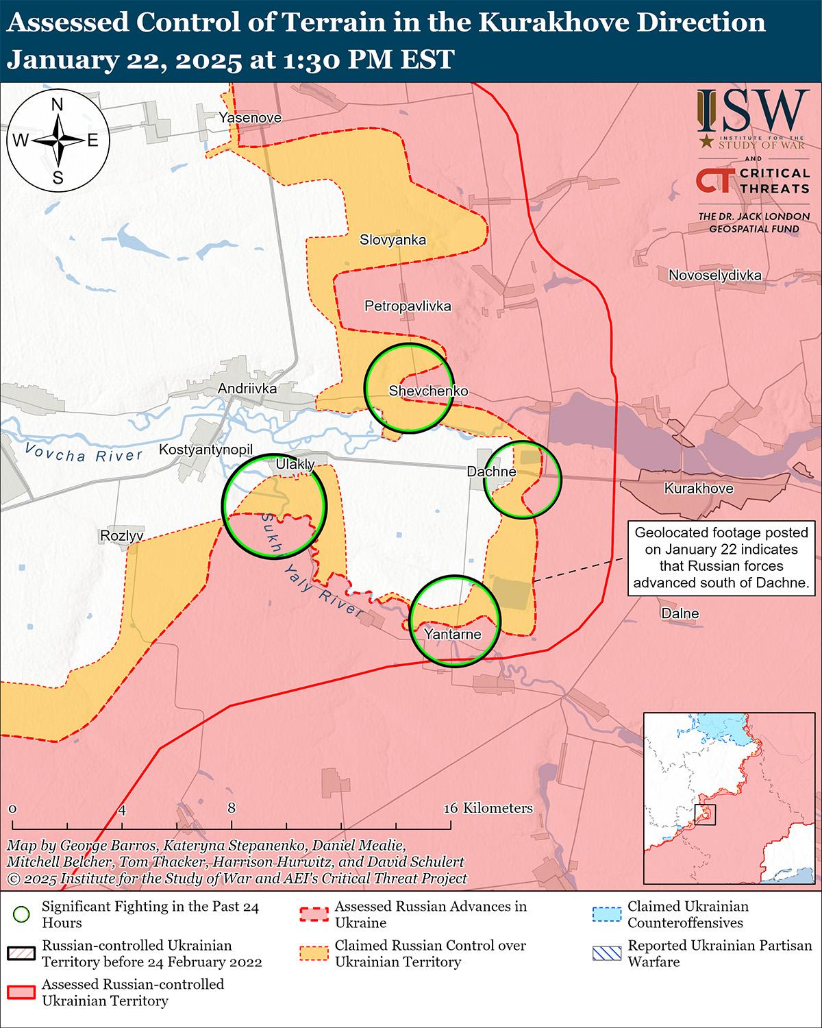 В последнее время российские войска продвинулись к западу от Курахово на фоне продолжающихся наступательных действий на Кураховском направлении 22 января. Геолоцированные кадры, опубликованные 21 января, указывают на то, что российские войска в последнее время незначительно продвинулись в полях к югу от Дачного (к западу от Курахово). [60] Российские военные блогеры утверждали, что российские войска продвинулись вдоль ветрозащитных полос к юго-западу от Словянки (к северо-западу от Курахово) и на два километра в направлении Константинополя (к западу от Курахово) и что российские войска зачищают украинские войска в районе к западу от Кураховского водохранилища (к западу от Курахово). [61] Однако ISW не обнаружила визуального подтверждения этих заявлений. 22 января Машовец заявил, что части российской 110-й мотострелковой бригады (51-я ОА) с момента своего последнего наступления 12 января испытывают трудности с продвижением в направлении Андреевки (к западу от Курахово), несмотря на то, что они были усилены частями 114-й мотострелковой бригады (51-й ОА). [62] Российские войска продолжали наземные атаки к северо-западу от Курахово в районе Словянки и Шевченко; западнее Курахово в районе Дачного, Андреевки и Константинополя; и юго-западнее Курахово в районе Улаклы и Янтарного 21 и 22 января. [63] Российский военный блогер утверждал, что украинские войска контратаковали в районе Андреевки и Зеленовки (к юго-западу от Курахово). [64]