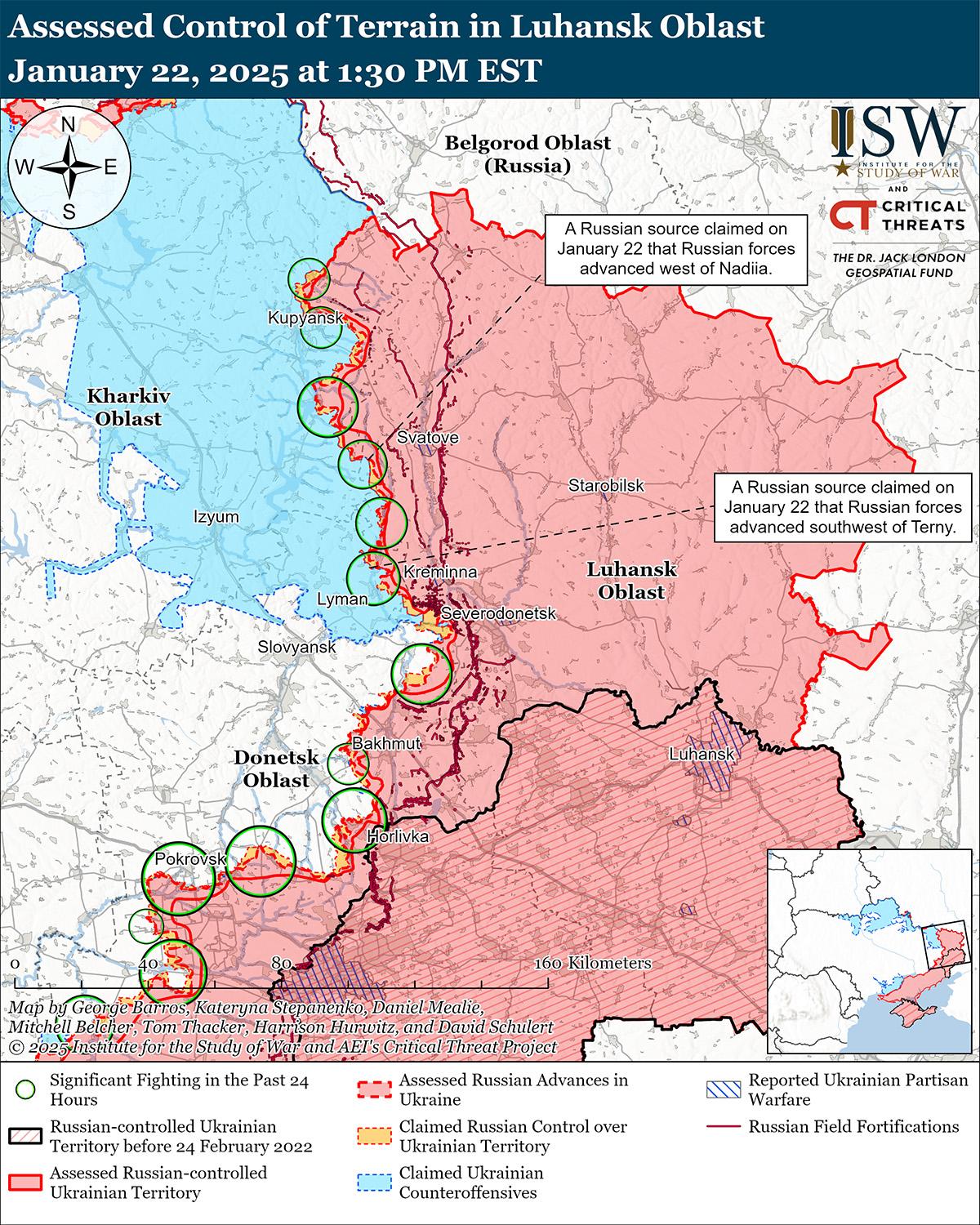 22 января враг продолжил наступательные действия на Купянском направлении, но подтвержденных успехов не имел. 22 января Министерство обороны России заявило, что российские войска захватили Западное (к северу от Купянска). [31] Российские военные блогеры заявили 22 января, что российские войска продвинулись к северу и югу от Западного, а также к югу и в центре Двуречной (к северо-востоку от Купянска). [32] Однако ISW не обнаружил подтверждения этих заявлений. 21 и 22 января российские войска продолжили наземные атаки к северу от Купянска в районе Двуречной и Кутковки и к востоку от Купянска в районе Петропавловки. [33] 22 января российский военный блогер заявил, что украинские войска контратакуют в районе Ольшаны (к северо-востоку от Купянска). [34] 22 января пресс-секретарь украинской группировки войск «Хортица» майор Виктор Трегубов заявил, что российские войска под покровом ночи пытаются пересечь реку Оскол в районе Двуречной небольшими судами, в частности небольшими резиновыми лодками. [35] Трегубов отметил, что украинские беспилотники нацелены на российские войска, пытающиеся пересечь реку Оскол и скрывающихся в лесопосадках. Трегубов также заявил, что российские войска ведут штурмовые действия на западном (правом) берегу реки Оскол, сосредоточили неустановленное количество личного состава и не наладили логистику через реку Оскол, так как вода не замерзла. Командир украинского батальона беспилотников, действующий на Купянском направлении, заявил 22 января, что российские командиры вынуждают пехоту атаковать, несмотря на плохие погодные условия, препятствующие надлежащему использованию поддержки дронов или бронетехники. [36] 22 января украинская группировка войск «Хортица» сообщила, что российские войска использовали неустановленное количество бронетехники для ведения недавних штурмов на Петропавловском направлении (к востоку от Купянска) и возле Лозовой (к северо-востоку от Боровой). [37] Сообщается, что операторы беспилотников российского Центра перспективных беспилотных технологий «Рубикон» продолжают работать на Купянском направлении. [38]
