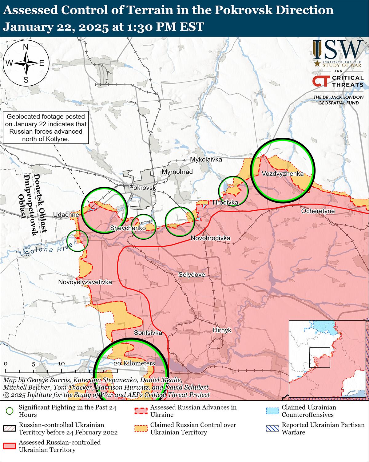 Российские войска недавно продвинулись к юго-западу от Покровска на фоне продолжающихся наступательных действий под Покровском 22 января. Геолоцированные кадры, опубликованные 22 января, свидетельствуют о том, что в последнее время российские войска продвинулись в полях к северо-востоку от Котлино (к юго-западу от Покровска) и в северо-восточной части населенного пункта. [54] Российские военные блогеры неоднократно утверждали, что российские войска продвинулись в районе Воздвиженки (к востоку от Покровска), захватили Барановку (к северо-востоку от Покровска и к северу от Воздвиженки) и Котлино (к юго-западу от Покровска), продвинулись на 3,6 км вглубь к западу от Волково (к юго-западу от Покровска) и в районе Надиевки (к юго-западу от Покровска). [55] Российский военный блогер утверждал, что российское военное командование недавно ввело в бой резервные силы к востоку от Покровска и что эти силы участвовали в якобы захвате Барановки. [56] Украинский военный обозреватель Константин Машовец заявил, что российские войска недавно привлекли к наступательным действиям к югу от Покровска части 30-й мотострелковой бригады (2-я ОА, Центральный военный округ). [57] По оценкам Машовца, в последние недели продвижение россиян к югу и востоку от Покровска замедлилось. Российский военный блогер заявил, что украинские войска контратакуют в районе Удачного (к юго-западу от Покровска). [58] Враг продолжил наступательные действия к востоку от Покровска в районе Водяного Второго, Зеленого Поля, Миролюбовки, Елизаветовки, Проминя и Мирнограда; юго-восточнее Покровска в районе Лысовки; южнее Покровска в районе Нового Труда, Зверево и Петропавловки; и к юго-западу от Покровска в районе Новосергиевки, Котлино, Успеновки и Срибного и в направлении Гришино (северо-западнее Покровска) 21 и 22 января. [59]