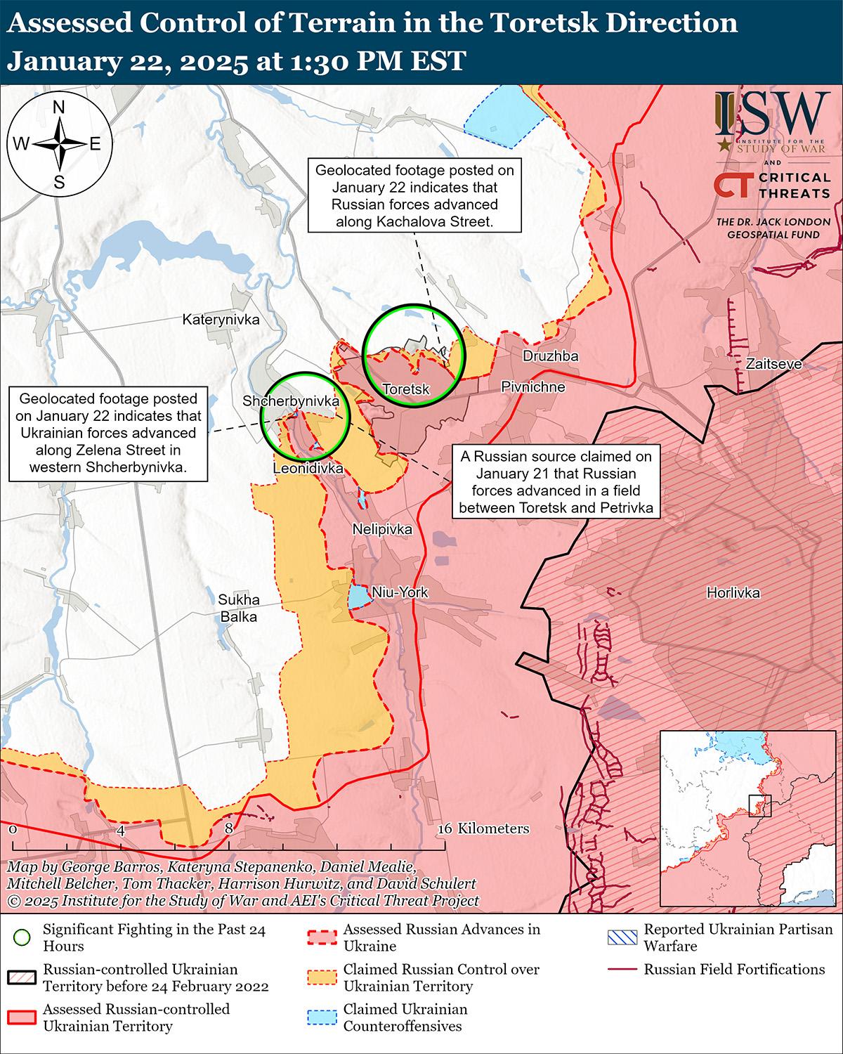 Украинские и российские войска в последнее время продвинулись на Торецком направлении на фоне продолжающихся наступательных действий в этом районе 22 января. На геолоцированных кадрах, опубликованных 22 января, видно, как операторы беспилотников российской 9-й мотострелковой бригады (51-я общевойсковая армия [ОА], ранее 1-й армейский корпус Донецкой Народной Республики [АК ДНР]) наносят удары по украинским силам в западной части Щербиновки (к западу от Торецка), что указывает на то, что украинские войска недавно вернули утраченные позиции в этом районе. [49] На геолоцированных кадрах, опубликованных 11 января и 22 января, видно, что российские войска продвинулись вдоль улиц Качалова и Пузанова на севере Торецка. [50] Командир украинского батальона, действовавшего на Торецком направлении, 22 января заявил, что украинские войска ведут оборону на ограниченных позициях в Торецке и пытаются сдерживать российские войска в населенном пункте. [51] 21 и 22 января российские военные блогеры утверждали, что российские войска продвинулись к полю между Торецком и Петровкой (к западу от Торецка) и что российские войска продвинулись к востоку от Торецкой шахты на севере Торецка, но ISW не обнаружил подтверждения этим заявлениям. [52] 21 и 22 января российские войска продолжали наземные атаки в районе Торецка. [53]
