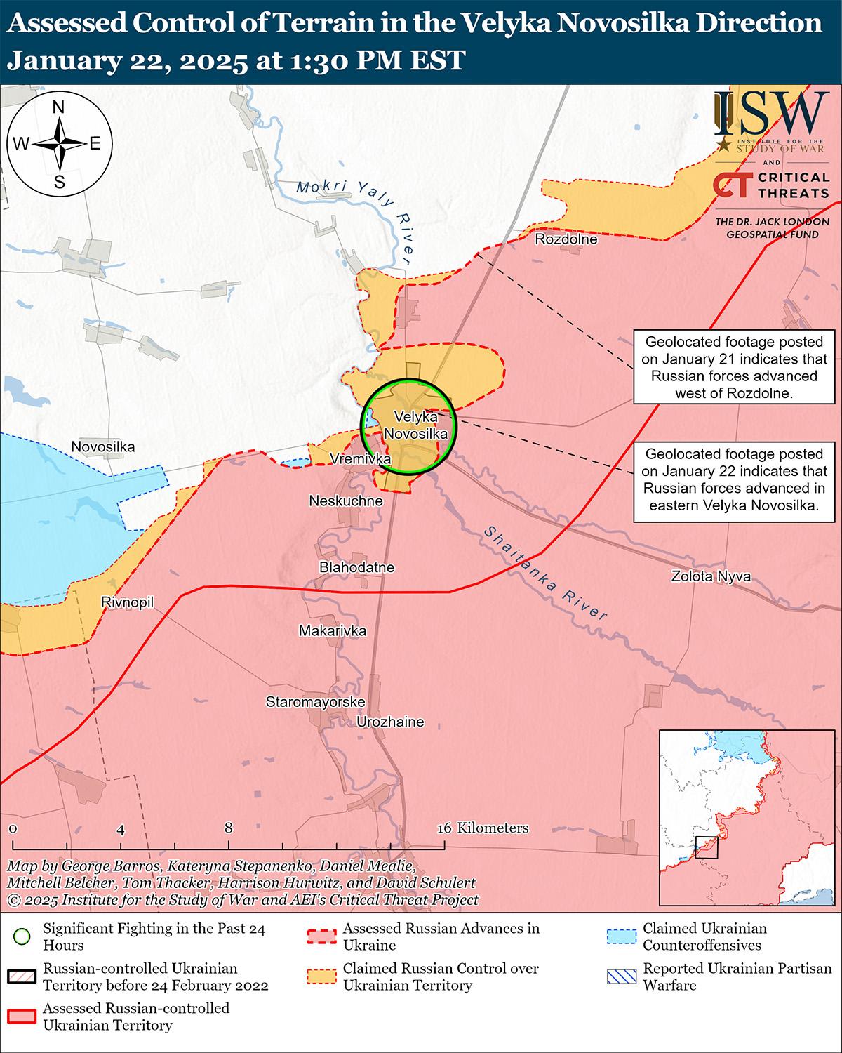 В последнее время российские войска продвинулись вблизи и в пределах Великой Новоселки на фоне продолжающихся наступательных действий в этом районе 22 января. Геолоцированные кадры, опубликованные 21 и 22 января, указывают на то, что российские войска недавно продвинулись вдоль дороги к западу от Роздольного (к северо-востоку от Великой Новоселки) и вдоль улицы Гаражная на северо-востоке Великой Новоселки. [65] Российские военные блогеры утверждали, что российские войска продвинулись к северу от Времовки (к западу от Великой Новоселки) и далее в восточной части Великой Новоселки, а также повторяли утверждения о том, что российские войска частично окружили украинские войска в Великой Новоселке с севера, востока и юга. [66] По словам Машовца, подразделения российской 37-й мотострелковой бригады (36-я ОА, Восточный военный округ) и 5-й танковой бригады (36-я ОА) ведут наступление в юго-восточной части Великой Новоселки, а в юго-западной части населенного пункта – части 127-й мотострелковой дивизии (5-я ОА). [67] Машовец отметил, что части российской 336-й бригады морской пехоты (Балтийский флот, Ленинградский военный округ [ЛМО]) продвигаются в районе северных окраин Великой Новоселки. [68] 21 и 22 января российские войска продолжили наземные наступления в районе Великой Новоселки и к западу от Великой Новоселки в районе Времовки. [69] Сообщается, что в Великой Новоселке действуют части 40-й бригады морской пехоты России (Тихоокеанский флот, ТОФ). [70]
