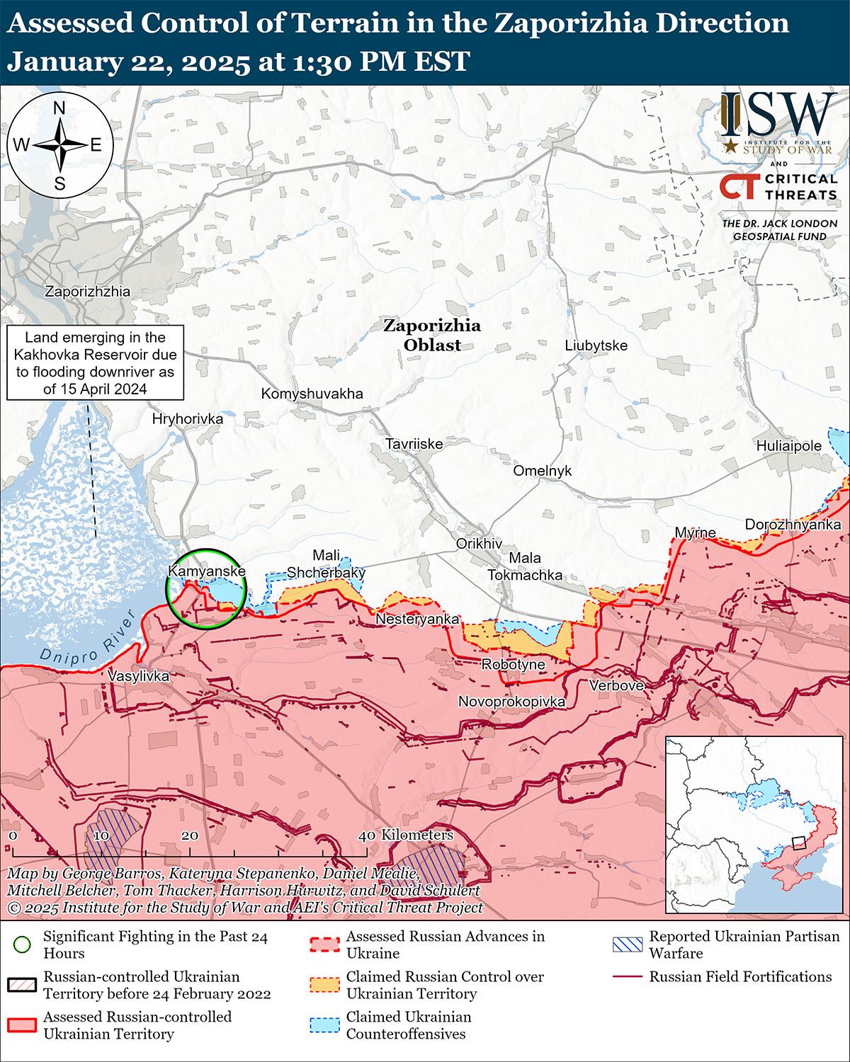 21 и 22 января российские войска продолжили ограниченные наземные атаки к северо-западу от Работино в районе Каменского, но не продвинулись вперед. [71] Сообщается, что операторы беспилотников российского отряда «Смуглянка» действуют на Запорожском направлении. [72]