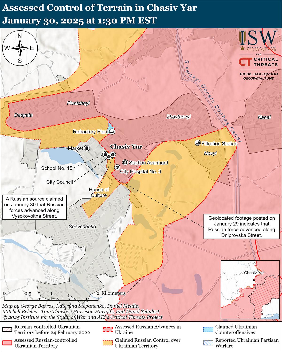В последнее время российские войска продвинулись в направлении Часова Яра на фоне продолжающихся российских наступательных действий в этом районе 30 января. Геолоцированные кадры, опубликованные 29 января, указывают на то, что российские войска в последнее время продвинулись вдоль улицы Днепровской в центре Часова Яра. [38] Российские военные блогеры утверждали, что российские войска продвинулись в районе Николаевки (к западу от Часова Яра); по улице Высоковольтной на юго-западе Часова Яра; в лесистой местности к югу от Часова Яра; вышли на окраины микрорайонов Шевченко и Цеха No 2 (оба на юго-западе Часова Яра); захватил большую часть микрорайона Северный на севере Часова Яра; и заняли позиции на вершине террикона на западном краю шахты Блок-9 (к югу от Часов Яра). [39] Однако ISW не обнаружил подтверждения этих заявлений. Другой российский военный блогер заявил, что российские войска продвинулись в лесистой местности к западу от Нового микрорайона в восточной части Часова Яра. [40] Российские войска продолжали наземные атаки в районе Часова Яра; севернее Часова Яра в районе Орехово-Васильевки и Новомарково; к юго-востоку от Часова Яра в районе Озаряновки; и к югу от Часова Яра в районе Предтечино 29 и 30 января. [41] По сообщениям, в Часовом Яру продолжают действовать предположительно подразделения российской добровольческой бригады «Эспаньола» (Российский добровольческий корпус); сообщается, что операторы беспилотников и другие подразделения 98-й воздушно-десантной дивизии (ВДВ) наносят удары по украинским целям в районе Часова Яра, в том числе к западу от Нового микрорайона; сообщается, что в микрорайоне Шевченко действуют снайперы 331-го полка ВДВ (98-я дивизия ВДВ); Сообщается, что подразделения 200-й мотострелковой бригады (14-й армейский корпус Ленинградского военного округа) действуют в северной части Часова Яра; сообщается, что операторы беспилотников бригады “Север-В” (Добровольческий корпус России) наносят удары по украинским объектам на направлении Часов Яр; подразделения 4-й мотострелковой бригады (3-я общевойсковая армия [ОА], бывший 2-й армейский корпус Луганской Народной Республики [АК ЛНР]) и чеченские силы «Ахмат» действуют вблизи Николаевки (к югу от Часова Яра); а также подразделения российского 27-го артиллерийского полка (6-я мотострелковая дивизия, 3-й АК) наносят удары по украинским силам на Константиновском направлении (к юго-западу от Часова Яра). [42]