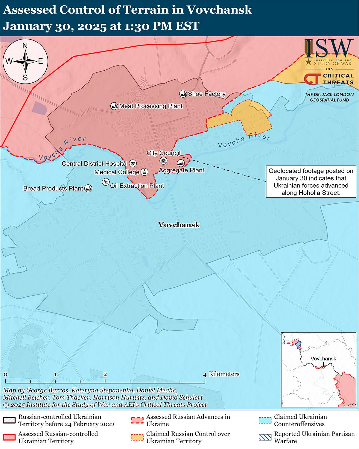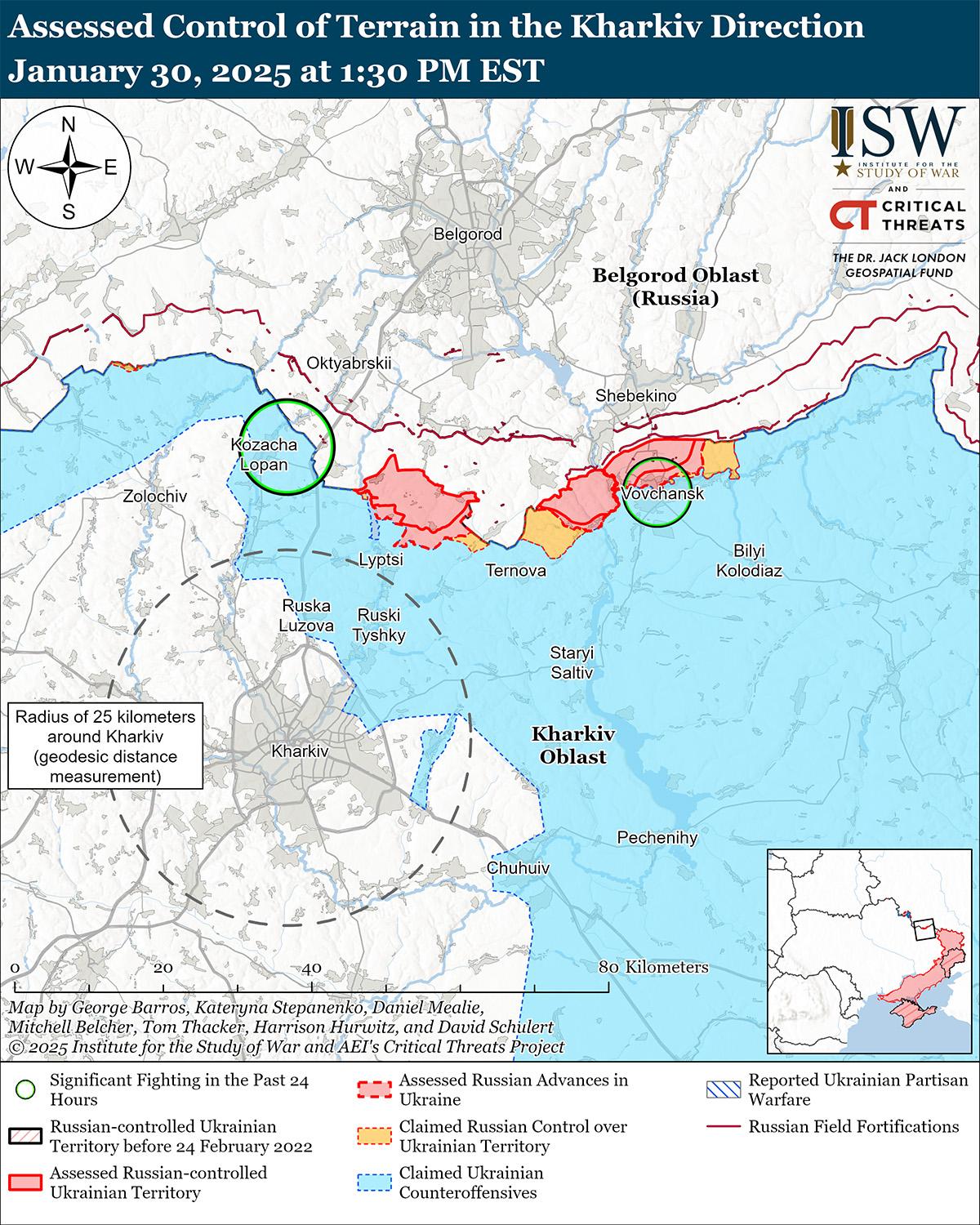 30 января украинские войска продвинулись к северо-востоку от Харькова на фоне продолжающихся российских наступательных операций на севере Харьковской области. Геолоцированные кадры, опубликованные 30 января, указывают на то, что украинские войска в последнее время незначительно продвинулись в северной части Волчанска (к северо-востоку от Харькова). [26] 29 и 30 января российские войска продолжили наступление в районе Казачьей Лопани (к северу от Харькова вдоль российско-украинской границы). [27]