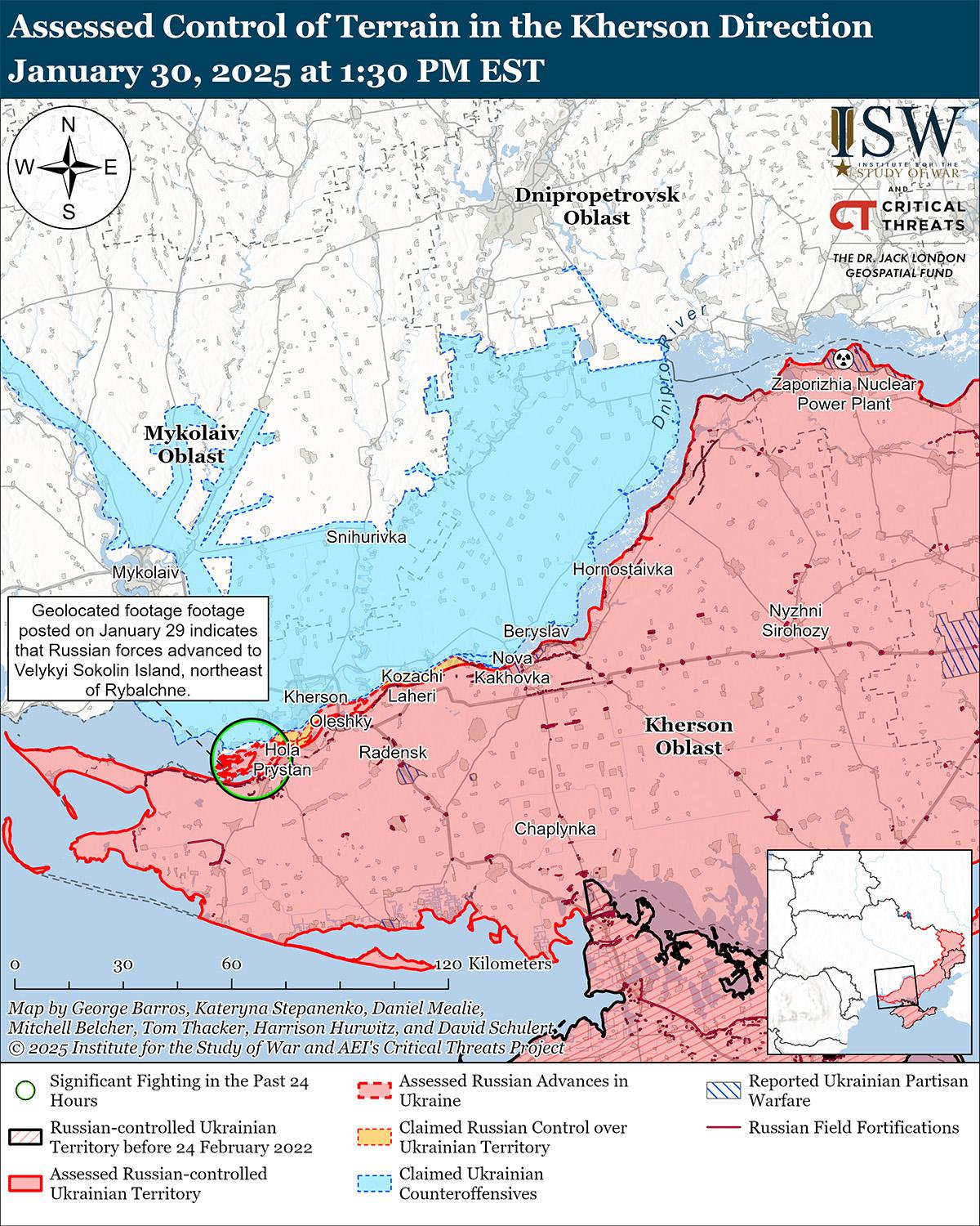 В последнее время российские войска продвинулись на Днепровском направлении на фоне продолжающихся наступательных действий в этом районе 30 января. [64] На опубликованных 29 января геолоцированных кадрах указано, что российские войска недавно захватили остров Большой Соколин (к юго-востоку от Херсона). [65]
