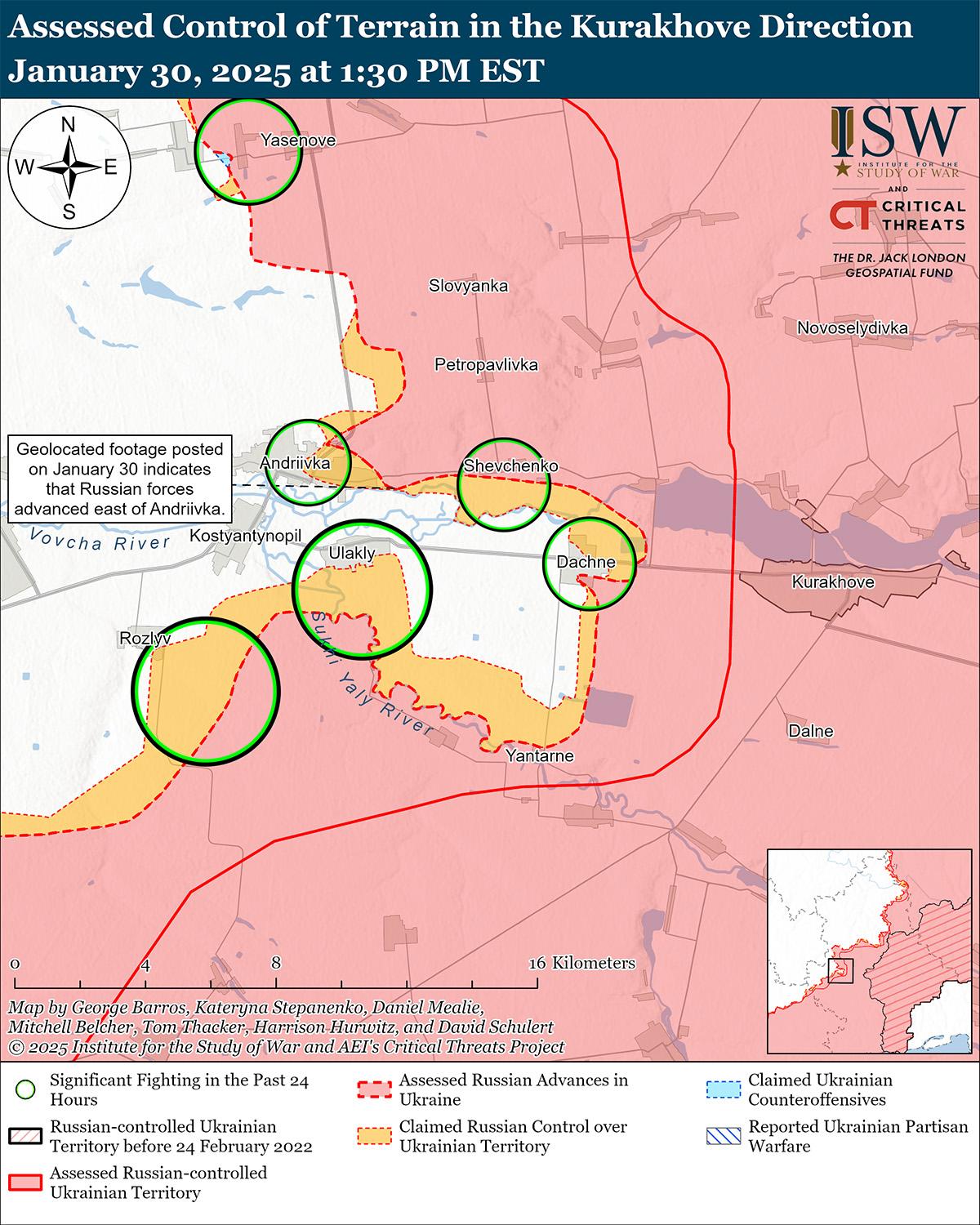 Украинские войска недавно продвинулись к юго-западу от Покровска на фоне продолжающихся российских наступательных операций в этом районе 30 января. Геолоцированные кадры, опубликованные 29 января, указывают на то, что украинские войска в последнее время незначительно продвинулись к западу от Новоандреевки (к юго-западу от Покровска). [47] Российские военные блогеры утверждали, что украинские войска также контратаковали вблизи Надиевки (к северу от Новоандреевки). [48] Представитель бригады Национальной гвардии Украины сообщил, что российские войска ведут исключительно пехотные атаки при ограниченной поддержке техники и что украинские беспилотники продолжают оставаться наиболее эффективным оружием для отражения российских атак на Покровском направлении. [49] Российские военные блогеры утверждают, что российские войска продвигаются к юго-западу от Покровска в районе Котлино и в лесистой местности к югу от Успеновки и медленно продвигаются на север от Воздвиженки (к востоку от Покровска). [50] Однако ISW не обнаружил подтверждения этих заявлений. Российские войска продолжили атаки в районе Покровска; восточнее Покровска в районе Воздвиженки, Малиновки, Водяного Второго, Елизаветовки, Проминя, Новоторецкого и Миролюбовки; юго-восточнее Покровска в районе Лысовки; южнее Покровска в районе Видродження (бывший Новый Труд) и Зверево; и юго-западнее Покровска в районе Котлино, Новоукраинки, Удачного, Котляровки и Ясеново 29 и 30 января. [51] Сообщается, что операторы беспилотников российского 1195-го мотострелкового полка (41-я ОА, Центральный военный округ [ЦВО]) действуют на Покровском направлении. [52]