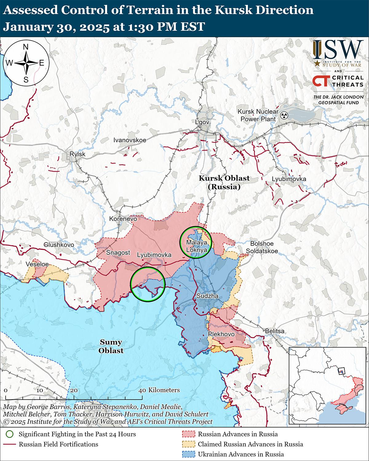 30 января российские войска продолжили наступательные действия в Курской области, но не добились подтвержденных успехов. Российские военные блогеры утверждали, что российские войска продвинулись к северо-востоку от Журавки вдоль украинско-российской границы, к полям к северо-востоку от Свердликово (к северо-западу от Суджи), вдоль реки Ивница в направлении трассы 38Н-071 (к северо-востоку от Малой Локни) и в неустановленных местах на севере Суджанского района. [19] Однако ISW не обнаружил подтверждения этих заявлений. Российские военные блогеры утверждали, что российские войска атаковали северо-запад Суджи в районе Свердликово и к югу от Суджи в районе Гуево и Махновки. [20] Сообщается, что операторы беспилотников российского 1434-го полка «Ахмат-Чечня» наносят удары по украинским позициям на Суджанском направлении; сообщается, что операторы беспилотников российской 83-й воздушно-десантной бригады (ВДВ) наносят удары по украинским солдатам на Курском направлении; Сообщается, что операторы беспилотников российской 34-й мотострелковой бригады (49-я общевойсковая армия [ОА], Южный военный округ [ЮВО]) продолжают наносить удары по украинским позициям в Погребках (к северо-западу от Суджи); и, вероятно, подразделения российского 56-го полка ВДВ (7-я дивизия ВДВ), как сообщается, действуют в районе Свердликово. [21]