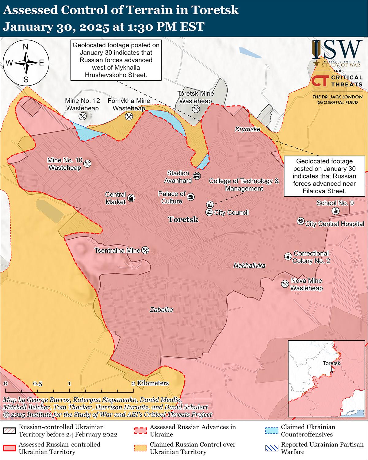 Российские войска недавно продвинулись в Торецке на фоне продолжающихся наступательных действий 30 января. Геолоцированные кадры, опубликованные 30 января, указывают на то, что российские войска недавно продвинулись в промышленной зоне на севере Торецка. [43] 29 и 30 января российские войска продолжили наземные атаки в Торецке, к северу от Торецка в районе Крымского и к западу от Торецка в районе Щербиновки. [44] 30 января представитель украинской бригады, действовавшей на Торецком направлении, сообщил, что украинские войска отбили утраченные позиции в районе Крымского (к северу от Торецка). [45] Представитель Украины сообщил, что украинские удары ограничивают способность российских войск использовать бронетехнику под Торецком и регулярно уничтожают технику по мере приближения российских войск к украинским позициям. Украинский спикер добавил, что украинские силы наблюдают за российскими силами, действующими небольшими штурмовыми подразделениями, состоящими из трех или четырех военнослужащих, и проводят атаки несколькими волнами этих небольших групп. Сообщается, что операторы беспилотников российского 80-го отдельного разведывательного батальона «Спарта» (51-я ОА, бывший 1-й АК Донецкой Народной Республики [ДНР]) и операторы беспилотников российского «Радикального следа» 1-й мотострелковой бригады (51-й ОА) наносят удары по украинским позициям под Торецком. [46]