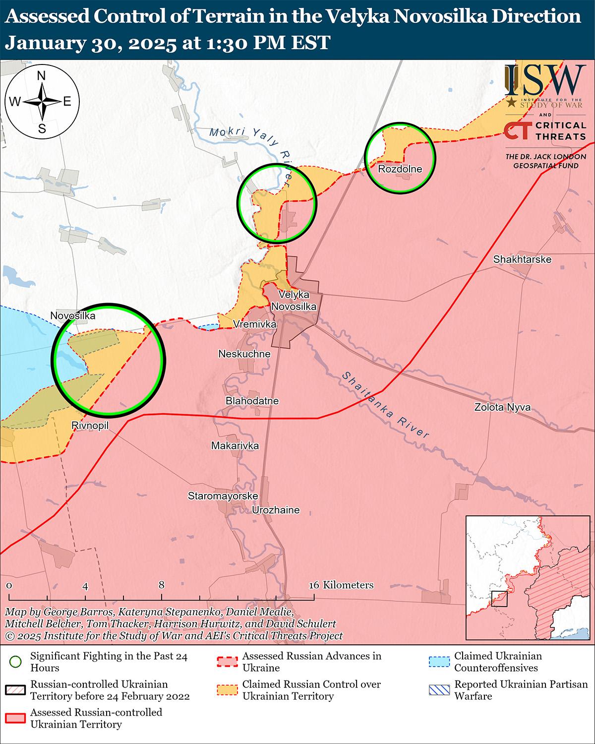 30 января российские войска продолжили наступательные действия в районе Великой Новоселки, но не добились подтвержденных успехов. 30 января российский военный блогер заявил, что российские войска продвигаются к северу и северо-западу от Великой Новоселки. [59] Однако ISW не обнаружил подтверждения этого заявления. 29 и 30 января российские войска атаковали к северо-западу от Великой Новоселки в районе Новоочеретуватого, к северу от Великой Новоселки в районе Нового Комара, к северо-востоку от Великой Новоселки в районе Раздольного и к юго-западу от Великой Новоселки в районе Новоселки. [60] Российский военблогер 30 января заявил, что российские войска быстро перегруппировались после предполагаемого захвата Великой Новоселки и провели одновременные атаки в направлении Великой Новоселки в районе Раздольного и в направлении Курахово в районе Андреевки.[61]