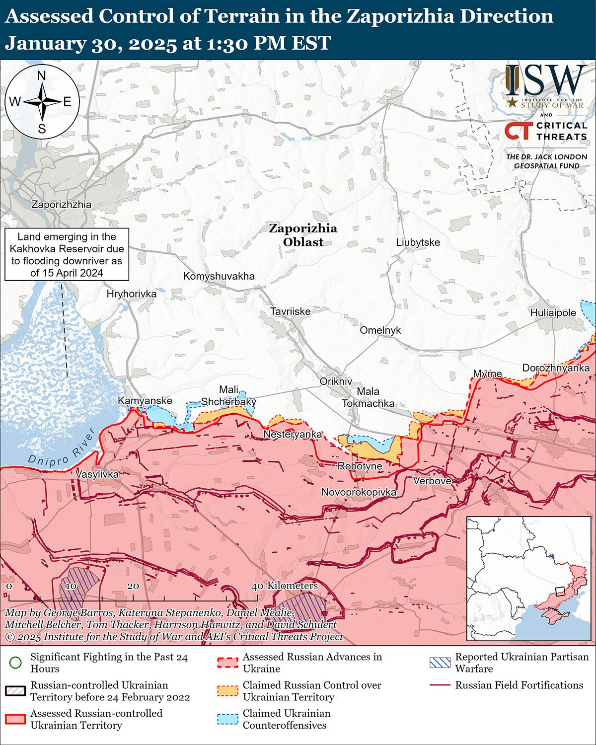 30 января российские войска продолжили атаки на западе Запорожской области на фоне заявлений россиян о том, что российские войска недавно продвинулись к северо-западу от Работино. 29 января российский военный блогер заявил, что российские войска продвинулись до улицы Центральной в Каменском (к северо-западу от Работино и к югу от Запорожья) и в прилегающей к нему территории дамбы, но ISW не обнаружил подтверждения этому заявлению. [62] Сообщается, что операторы беспилотников российского 1455-го мотострелкового полка (по сообщениям, 42-й мотострелковой дивизии 58-й общевойсковой армии [ОА] Южного военного округа) наносят удары по украинским позициям в районе Орехова. [63]