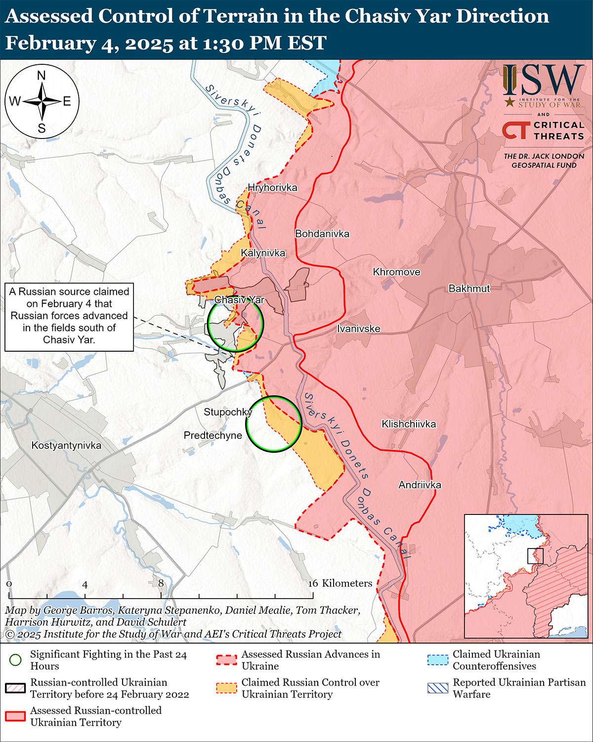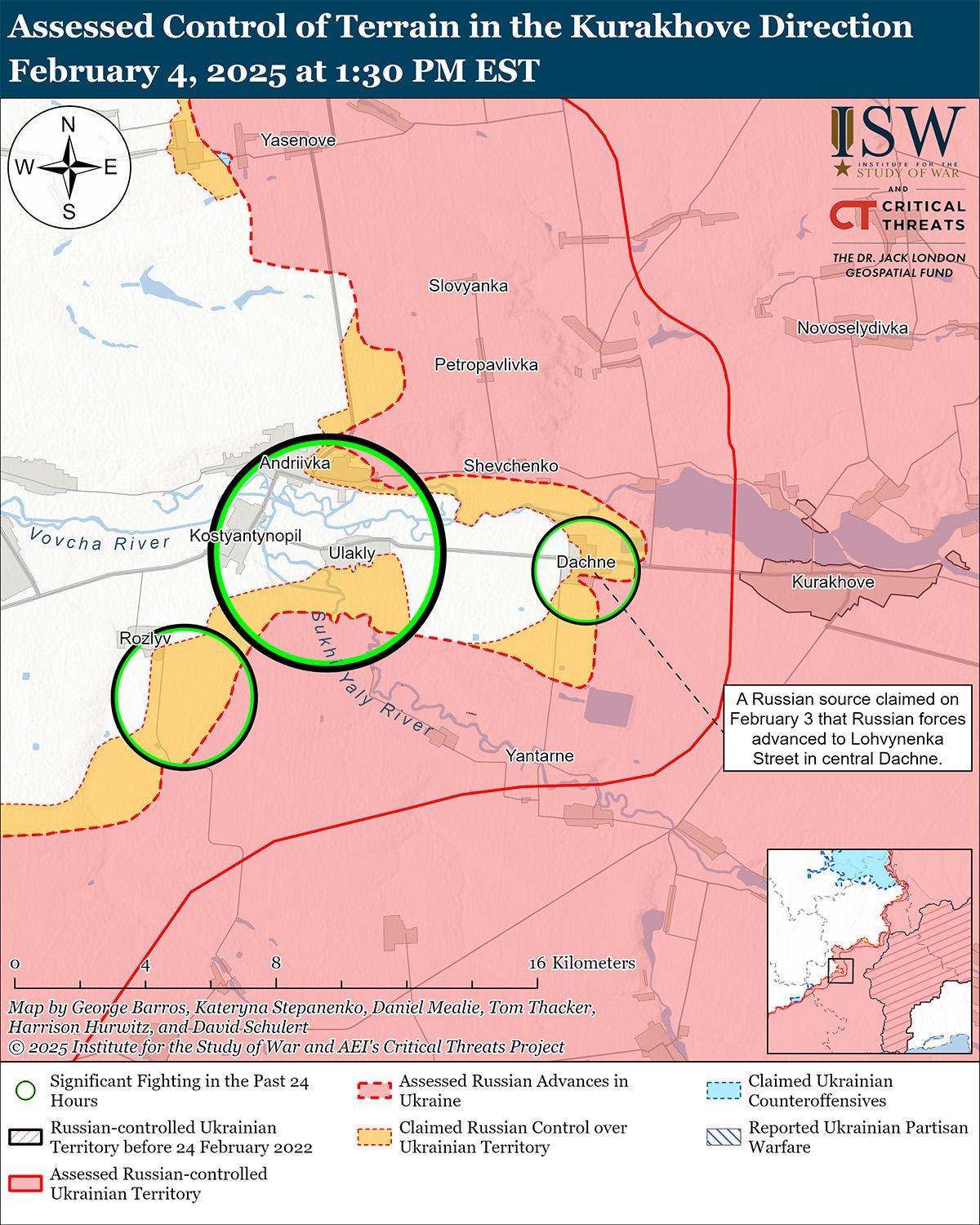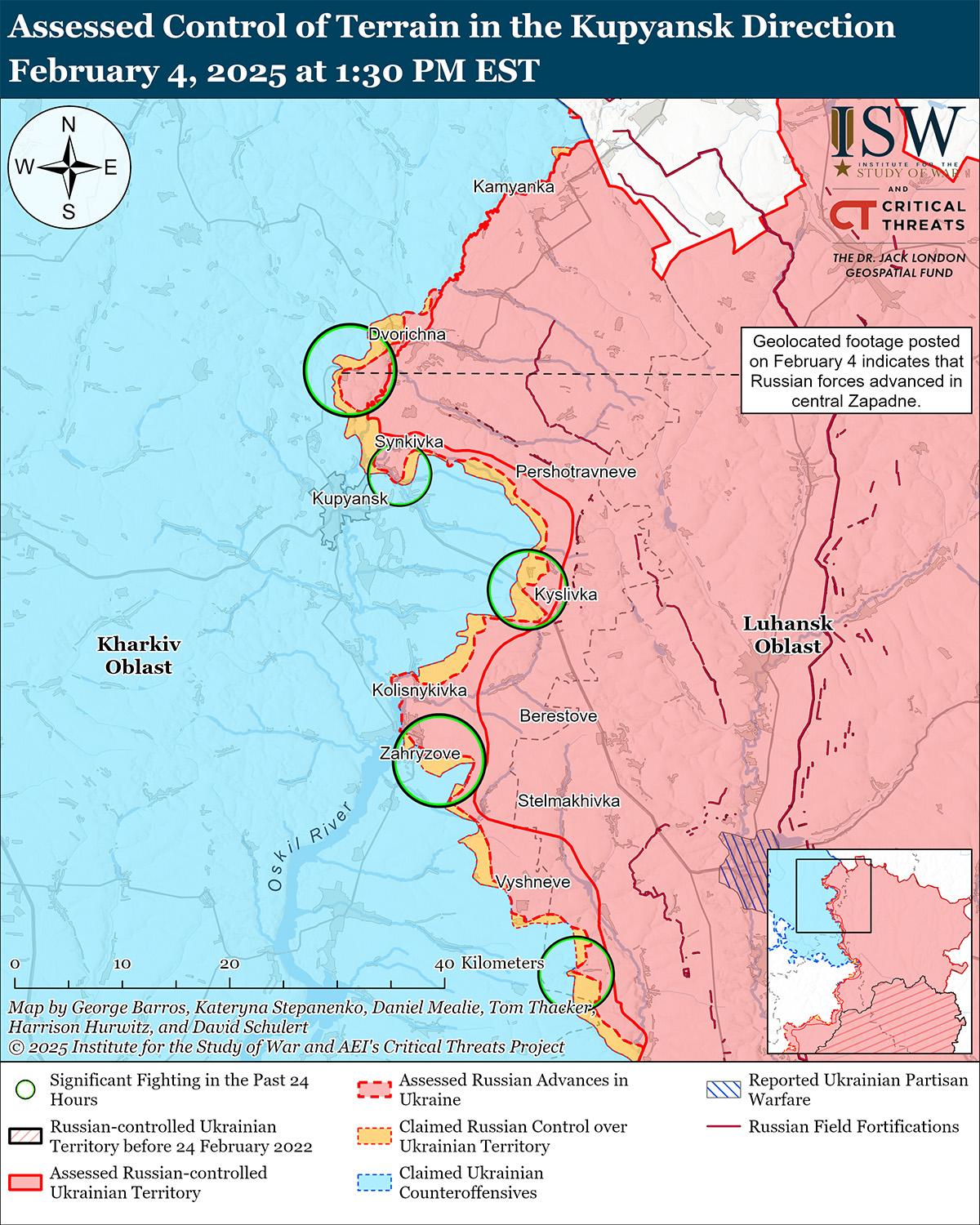Оценка российского продвижения: Геолоцированные кадры, опубликованные 4 февраля, указывают на то, что российские войска недавно продвинулись в центральной части Западного (к северу от Купянска). [43]