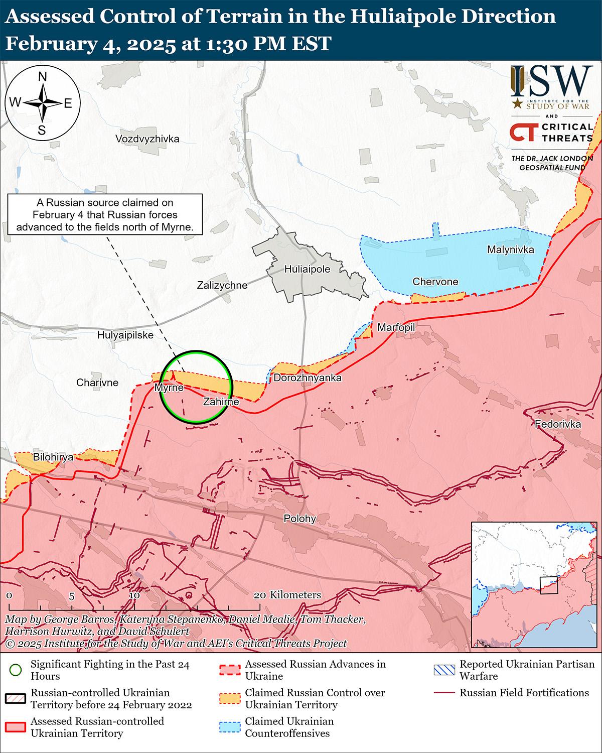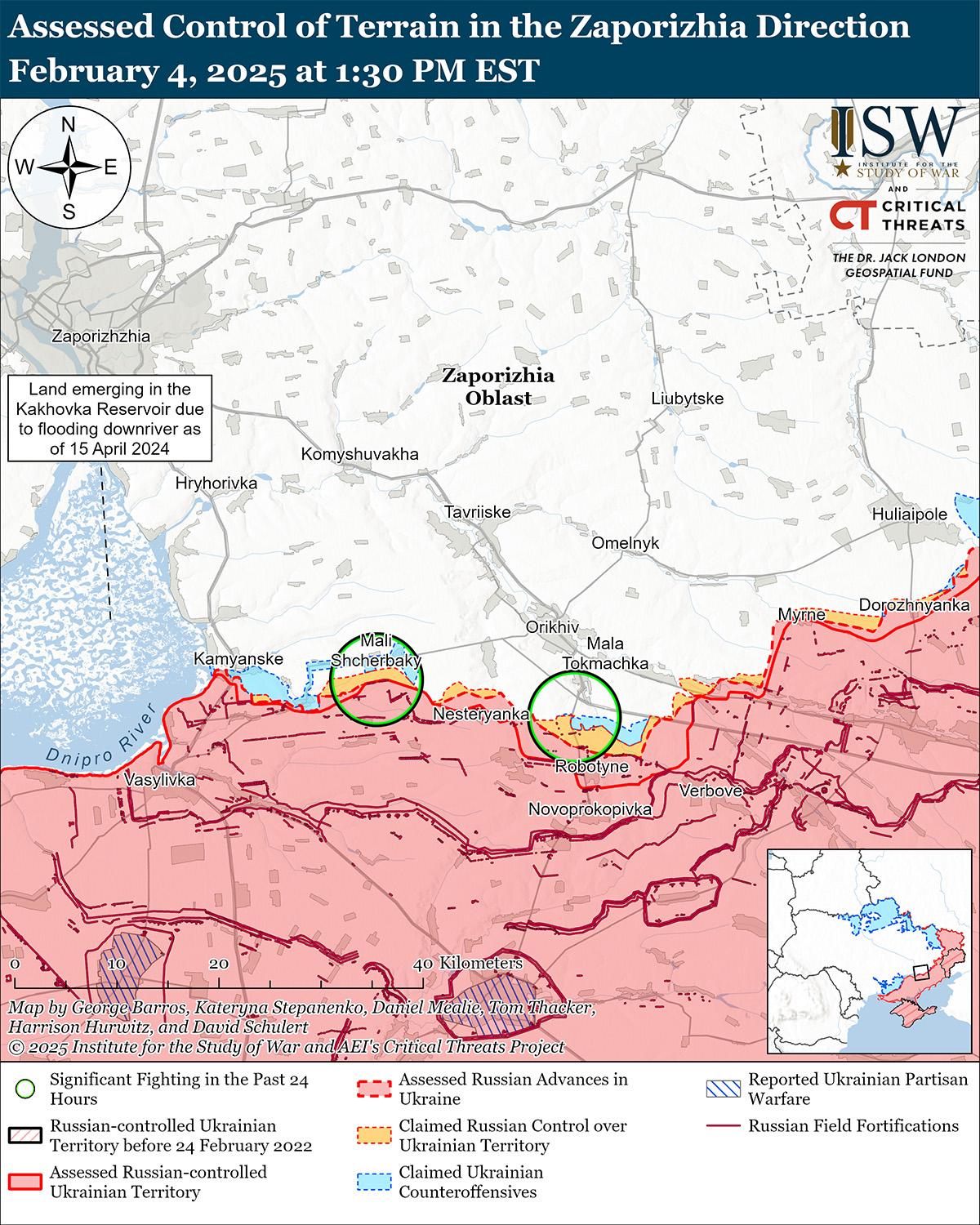 4 февраля российские войска продолжили ограниченные наземные атаки на Запорожском направлении, но не добились подтвержденных успехов. 3 и 4 февраля российские войска провели ограниченные наземные атаки на западе Запорожской области в районах населенных пунктов Новоданиловка (к северу от Работино) и Щербаки (к северо-западу от Работино).[89]
