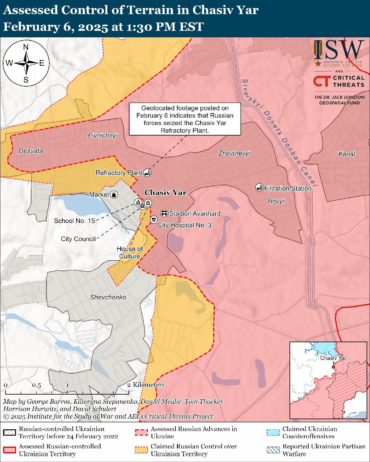 Оценка российского продвижения: геолоцированные кадры, опубликованные 6 февраля, указывают на то, что российские войска недавно продвинулись к западу от центрального огнеупорного завода в Часовом Яру и, вероятно, захватили оставшуюся часть огнеупорного завода. [52]