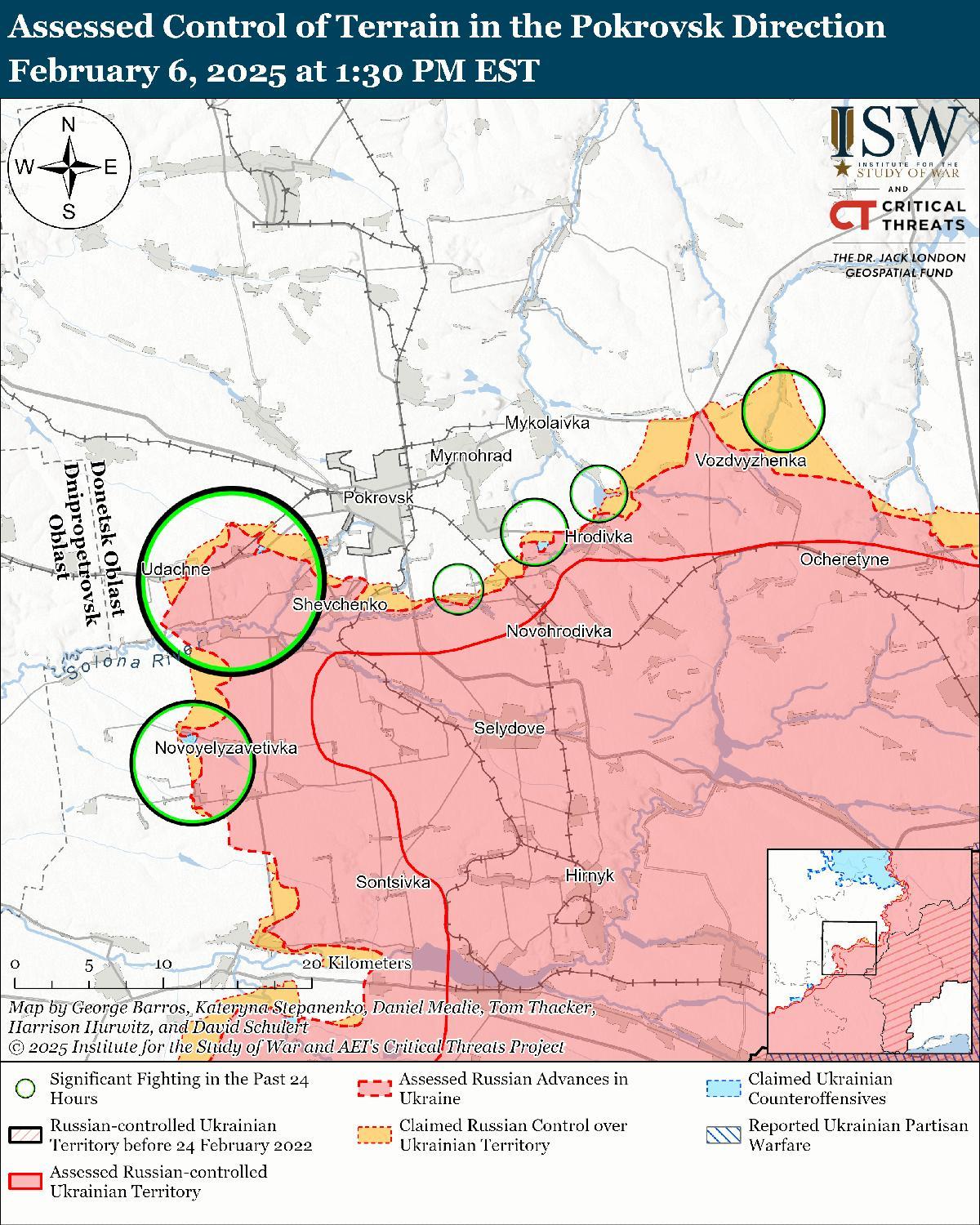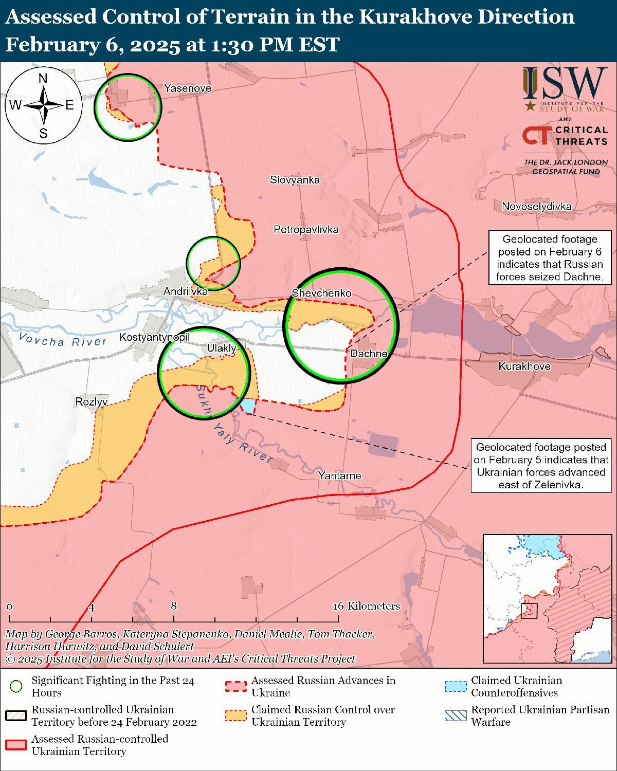 Оценка украинского продвижения: Геолоцированные кадры, опубликованные 6 февраля, указывают на то, что украинские войска недавно продвинулись к востоку от Зеленовки (к юго-западу от Курахово). [68]
