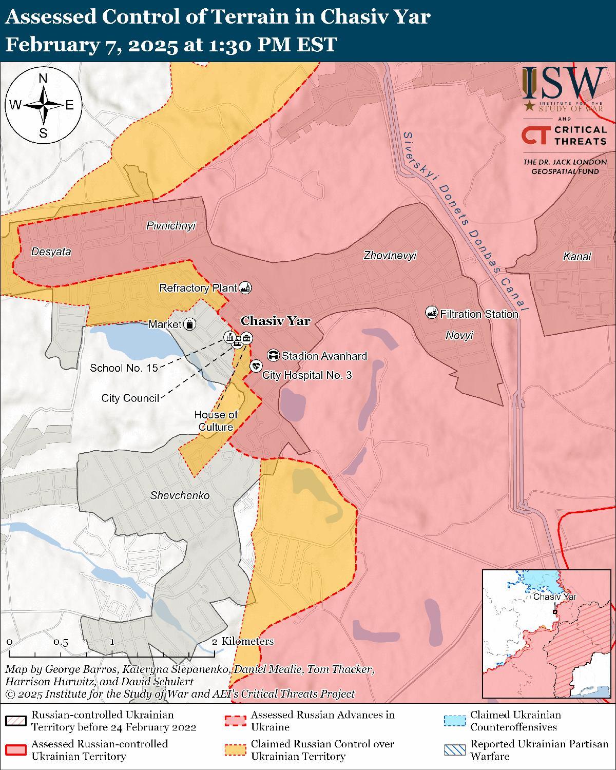 Российские источники заявили 7 февраля, что российские войска захватили стадион «Авангард» и больницу No 3 в центре Часова Яра и три жилых района на западе Часов Яра. [52] Однако ISW не обнаружил подтверждения этих заявлений.