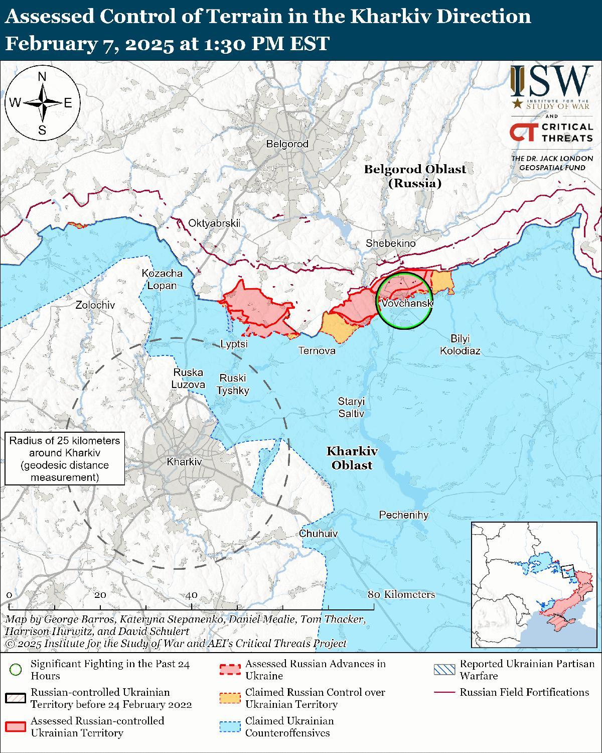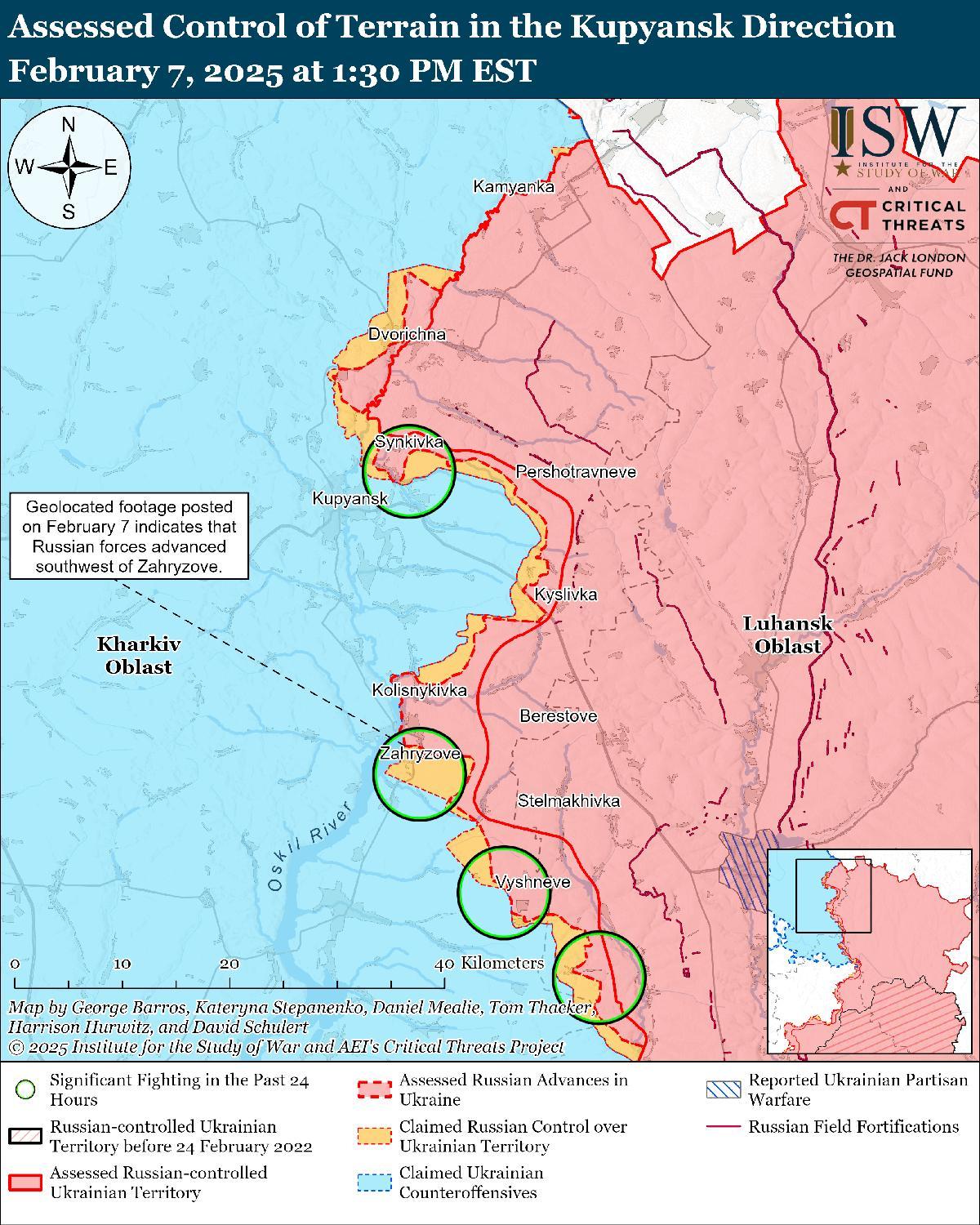 Оценка российского продвижения: геолоцированные кадры, опубликованные 7 февраля, указывают на то, что российские войска недавно продвинулись к северо-западу от Загрызово (к северо-востоку от Боровой). [41]