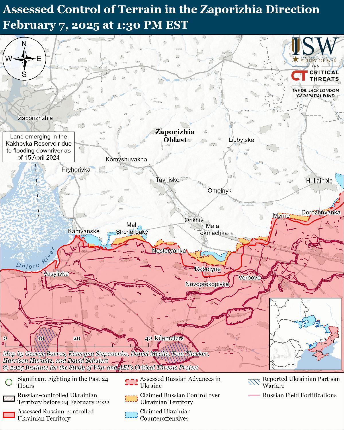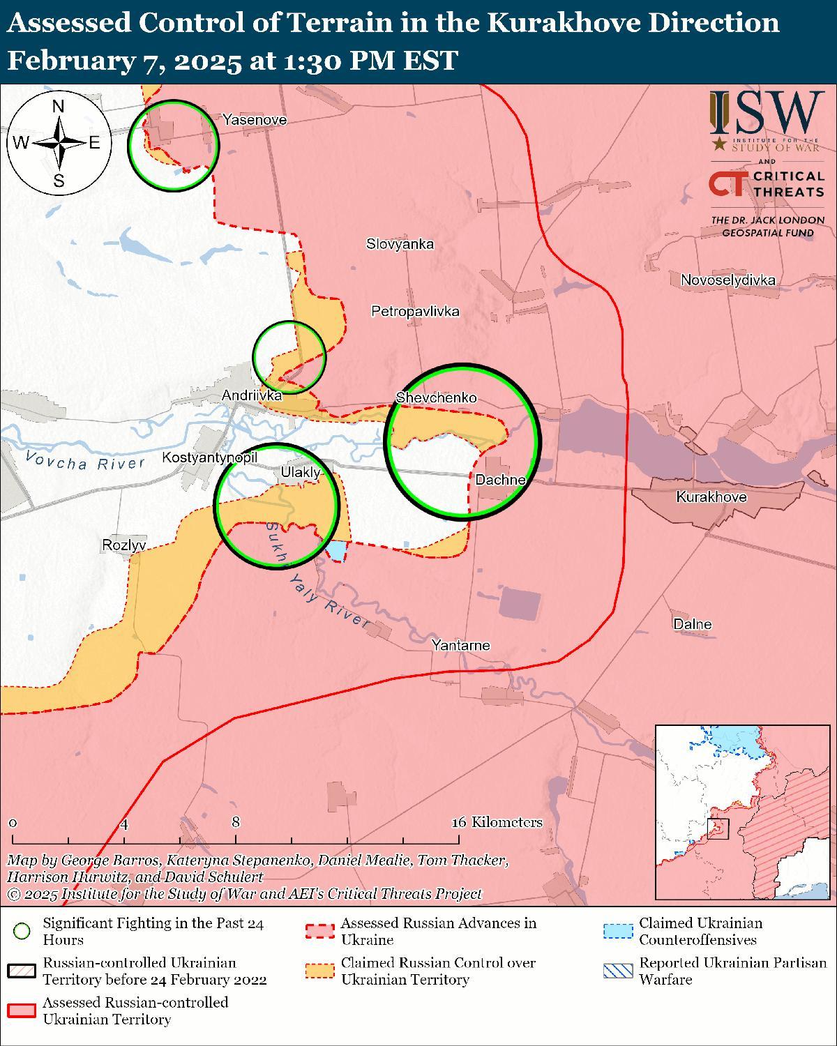 - Украинские войска незначительно продвинулись во время механизированных штурмов на своем выступе в Курской области 6 февраля, но российские источники заявили 6 и 7 февраля, что российские войска по крайней мере временно приостановили продвижение украинских войск к юго-востоку от Суджи.