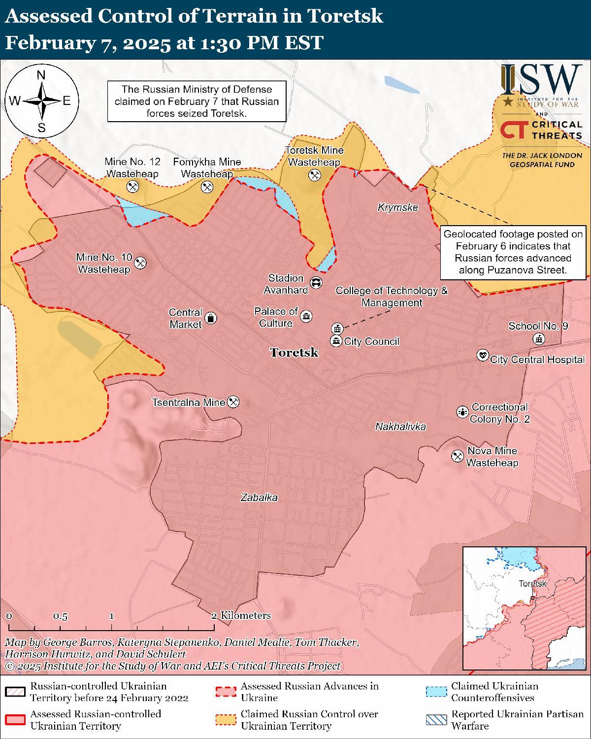 Российские войска недавно продвинулись на севере Торецка на фоне утверждений о том, что российские войска захватили Торецк 7 февраля. 6 и 7 февраля российские войска атаковали в самом Торецке и к северу от Торецка в районе Дилиевки. [56]